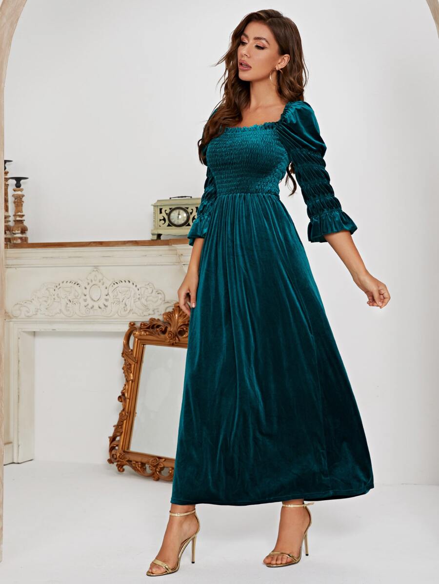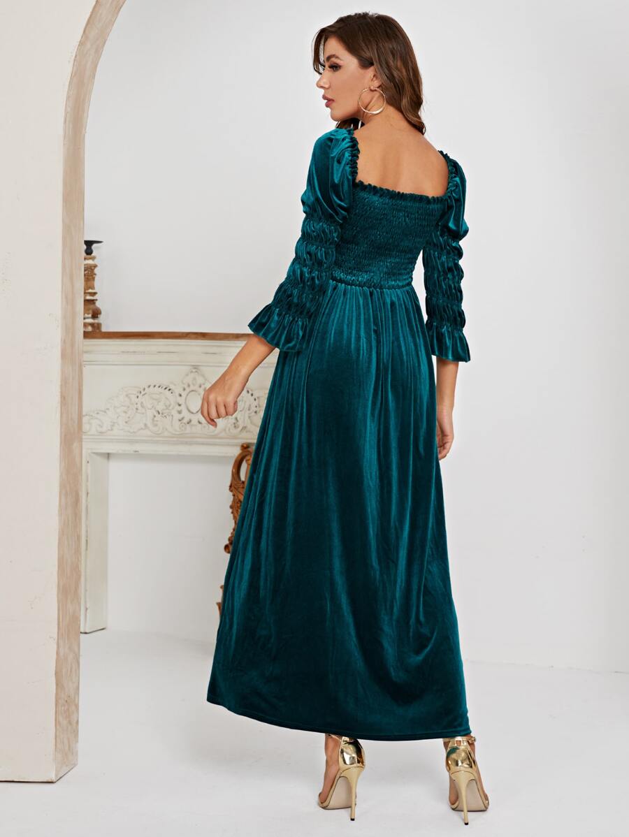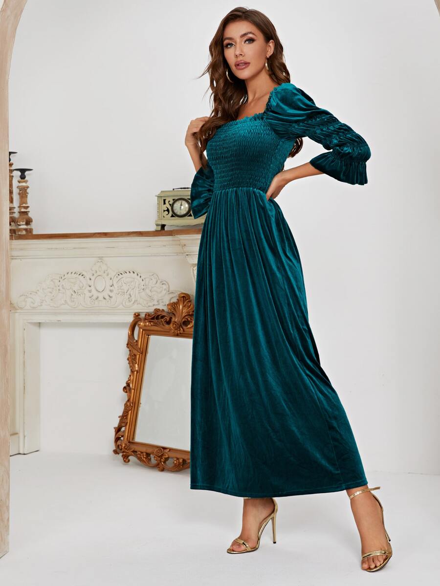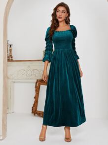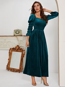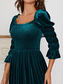 Square Neck Shirred Puff Sleeve Velvet Dress
