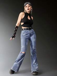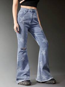 Grunge Punk Star Print Ripped Flare Leg Jeans