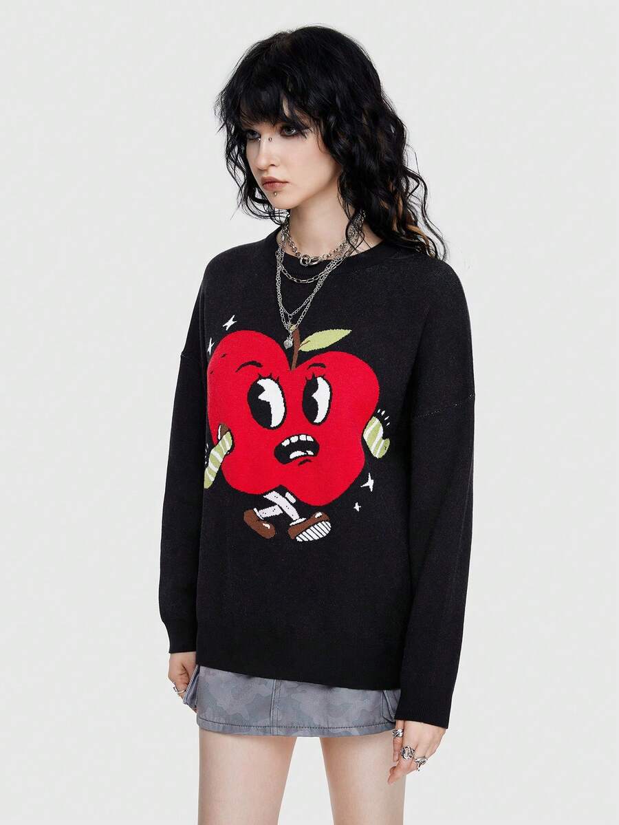 Street Life Funny Street Style Cute Apple Design Color Block Loose Fit Pullover Sweater For Women's Outdoor Activities