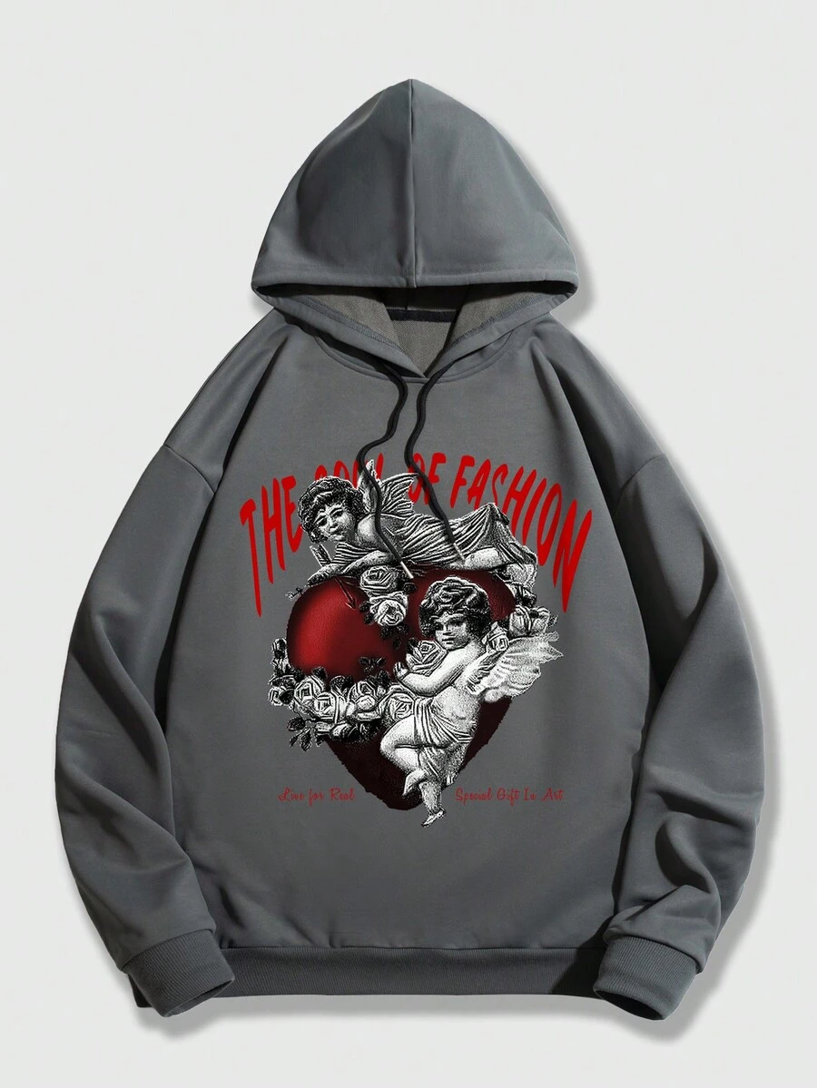 Street Life Men Angel Pattern Drawstring Hoodie 1/4 Zip For Everyday Wear