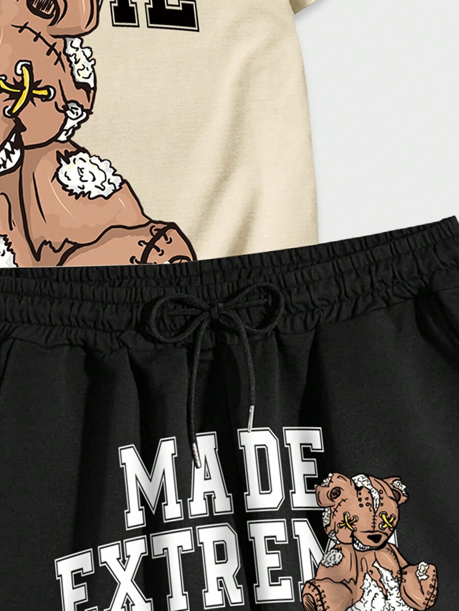 Street Life Men Bear Letter Graphic Tee & Striped Trim Drawstring Shorts, School