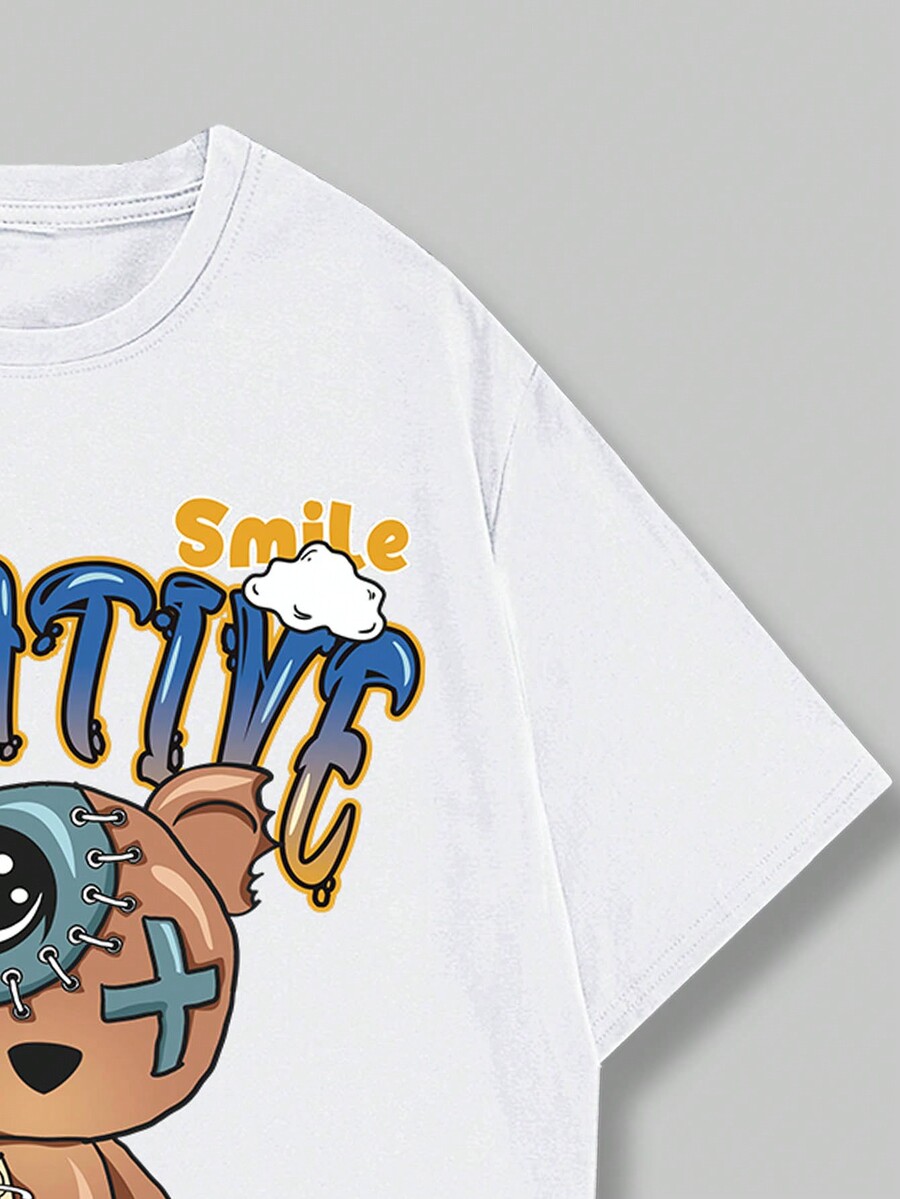 Street Life Men Cartoon Bear & Letter Pattern T-Shirt And Drawstring Waist Shorts 2pcs/Set, School