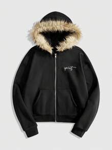 Street Life Men's Autumn/Winter Letter Print Patchwork Fluffy Hooded Zip-Up Casual Sweatshirt