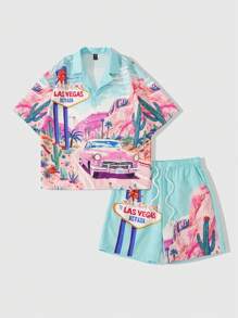Street Life Men's Boxy Fit Landscape Print Shirt And Shorts Set, Casual Holiday Vacation Outfit