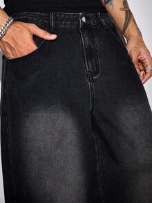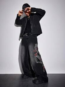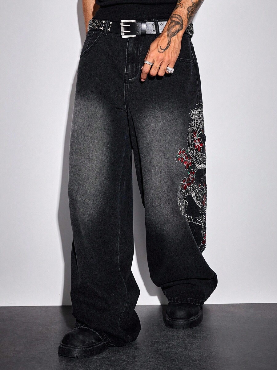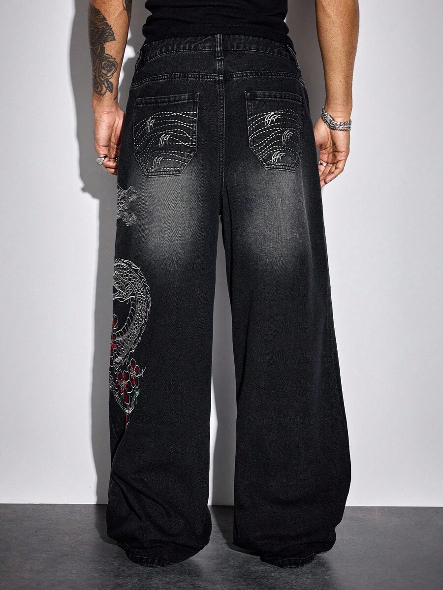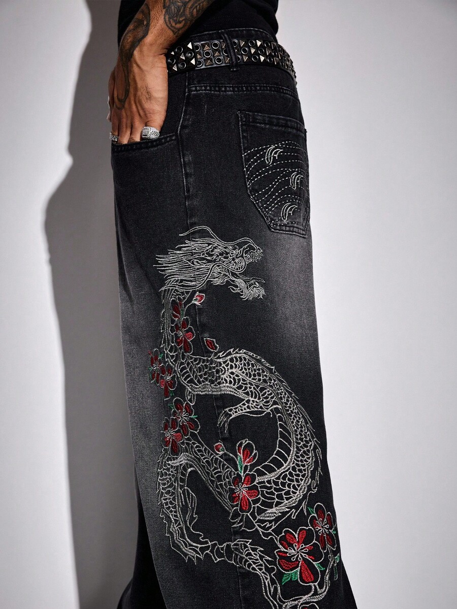 Street Life Men's Casual Fashion Street Embroidered Chinese Dragon & Floral Pattern Washed Loose Wide-Leg Jeans
