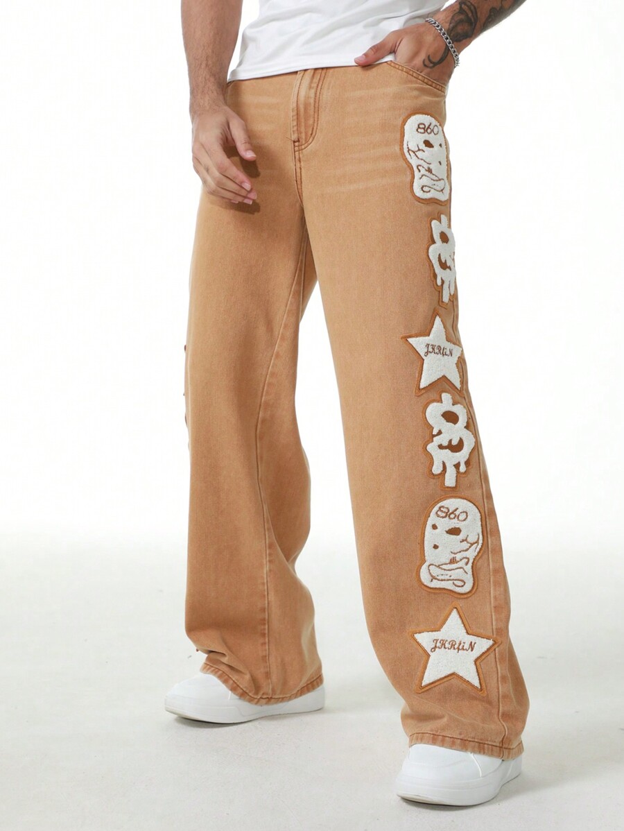 Street Life Men's Casual Star Embroidery Relaxed Fit Jeans