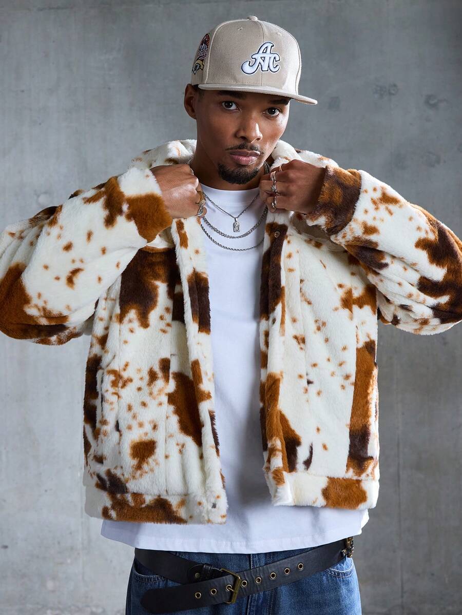 Street Life Men's Cow Print Plush Fabric Turndown Collar Jacket