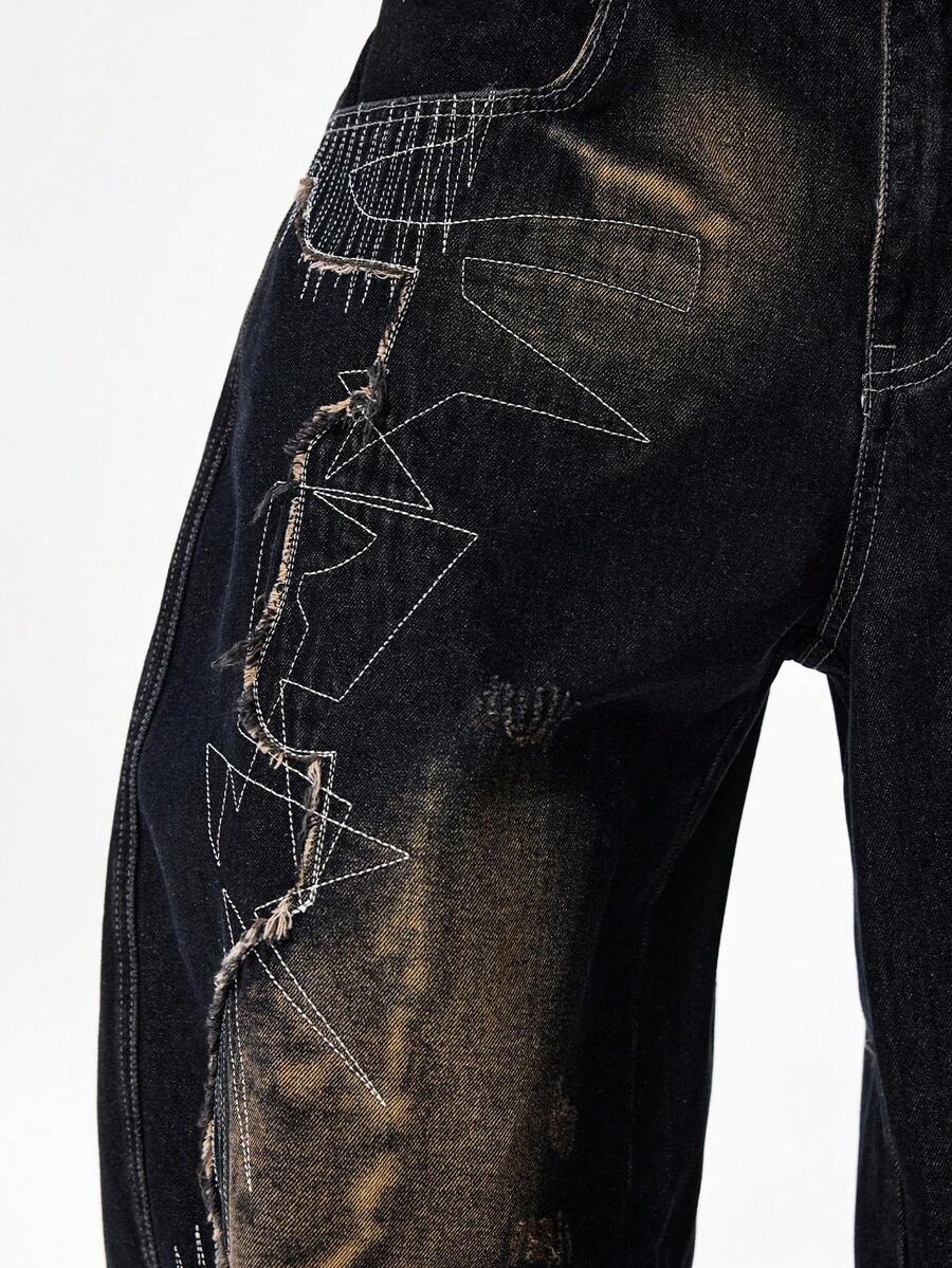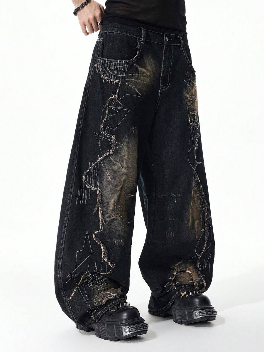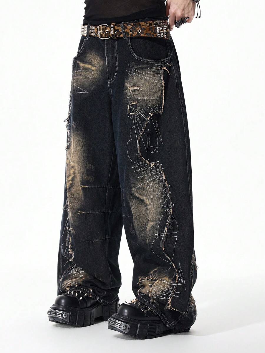 Street Life Men's Distressed Patchwork Dark Denim Jeans With Curved Hem