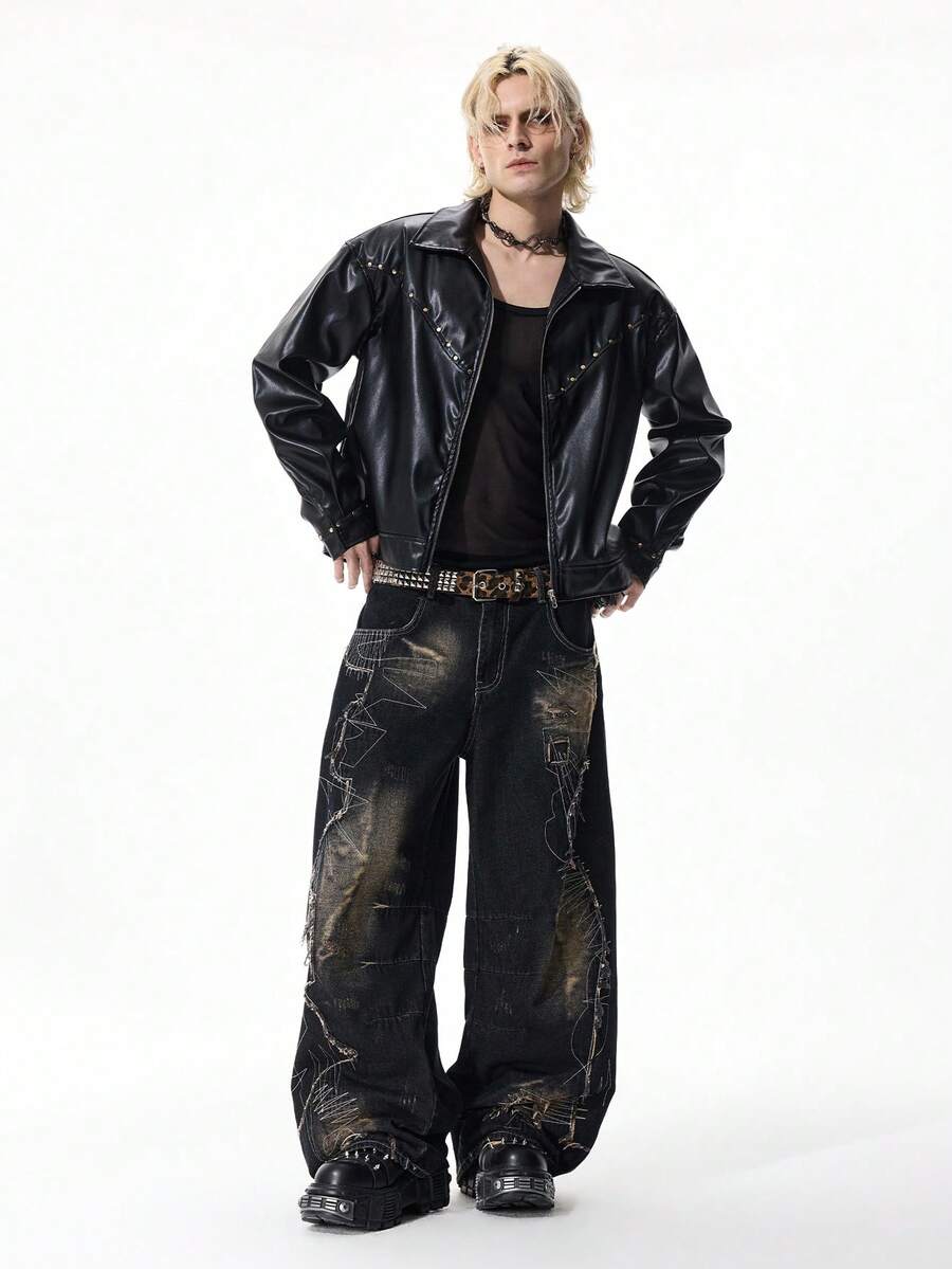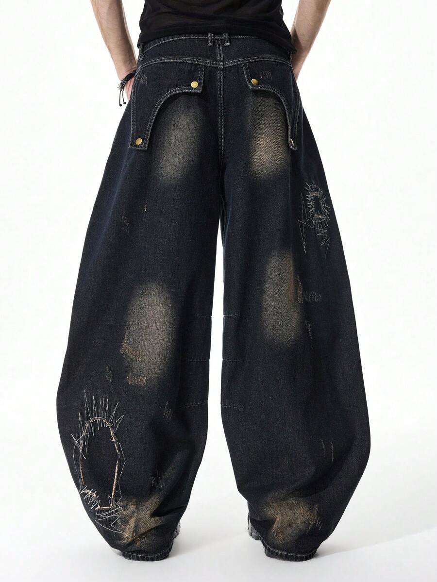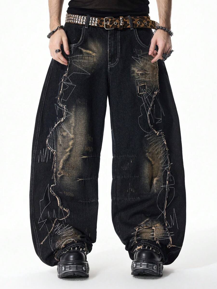 Street Life Men's Distressed Patchwork Dark Denim Jeans With Curved Hem