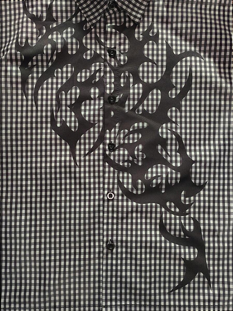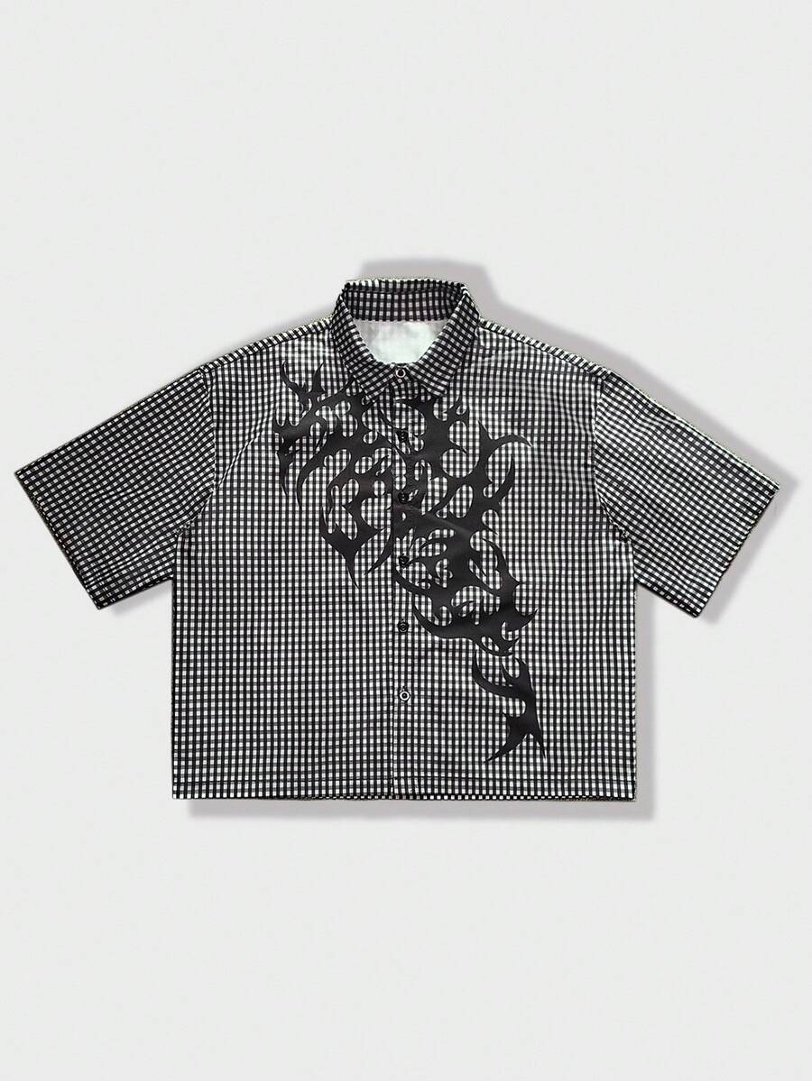 Goth Men's Flame Print Plaid Short Sleeve Shirt