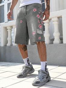 Street Life Men's Floral Embroidered Loose Denim Shorts Jorts