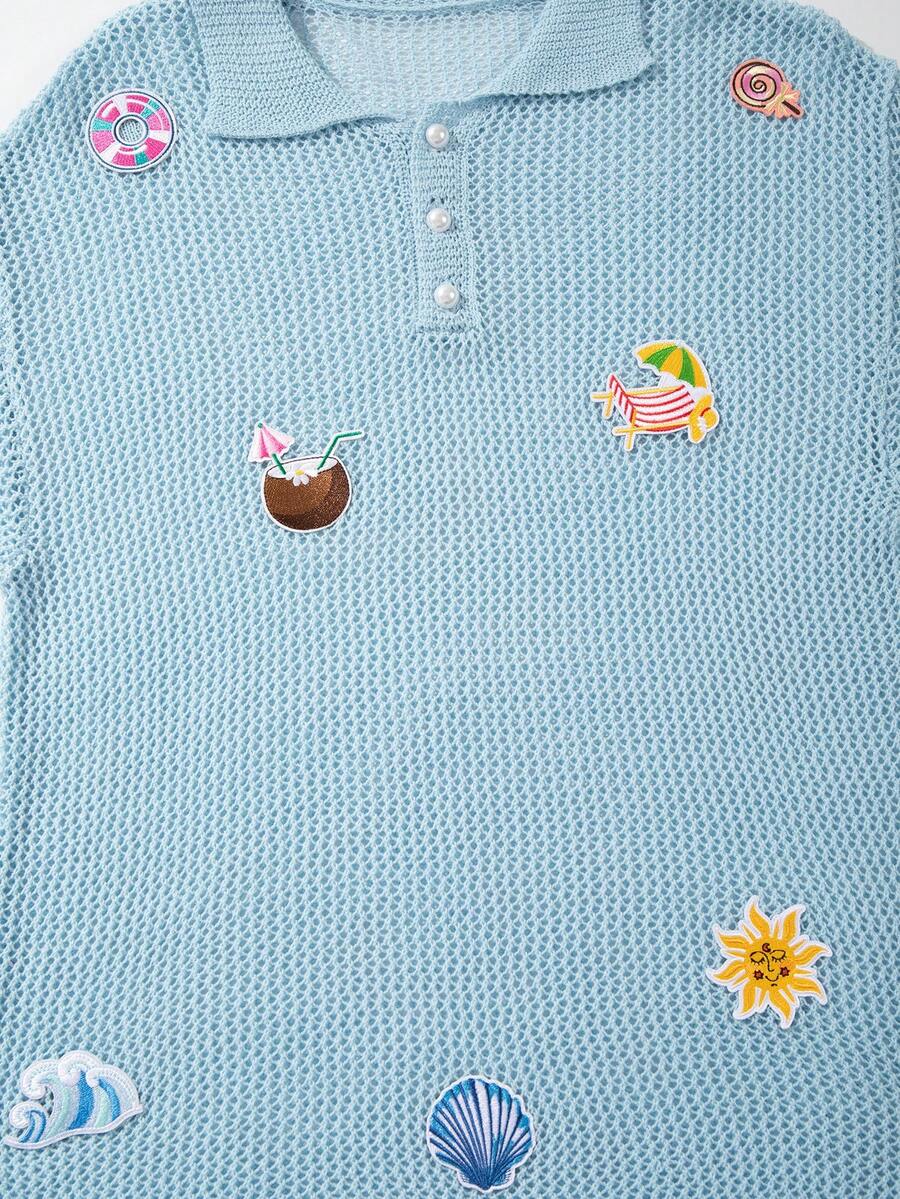 Casual Men's Floral Embroidery Half Open Collar Short Sleeve Cute Knit Top, Summer Vacation