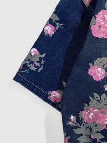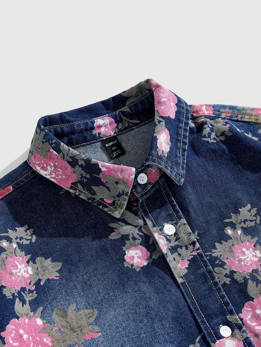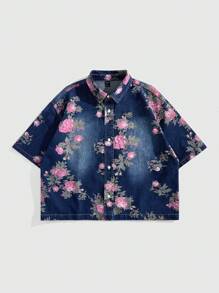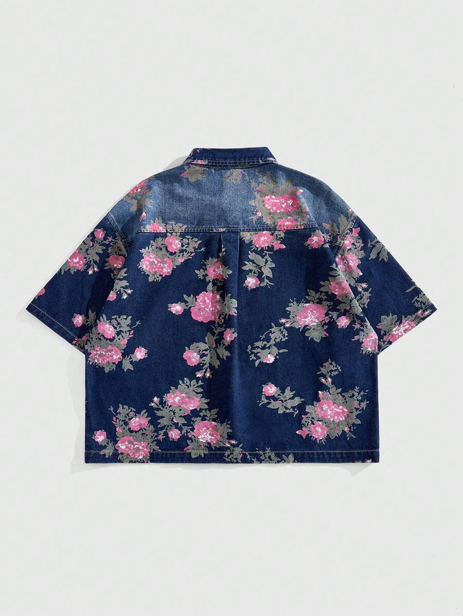 Street Life Men's Floral Print Short Sleeve Single Breasted Loose Casual Denim Jacket