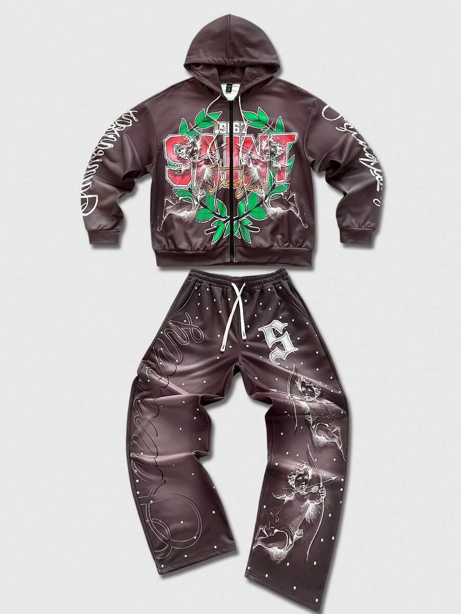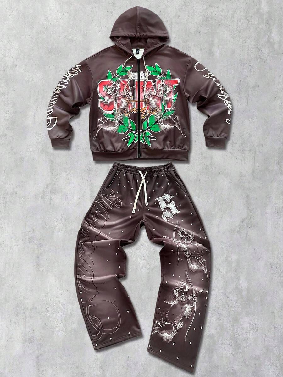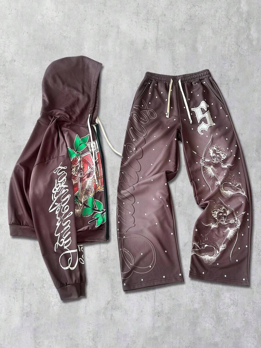 Street Life Men's Hooded Sweatsuit, Angel Child English Graphic Print Street Style Hoodie Set, Autumn/Winter