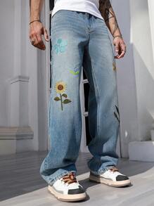 Street Life Men's Loose Fit Floral Embroidered Straight-Leg Jeans