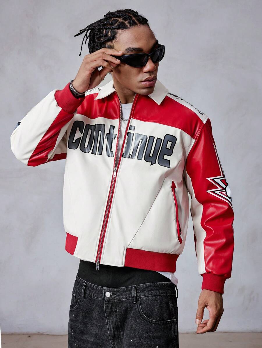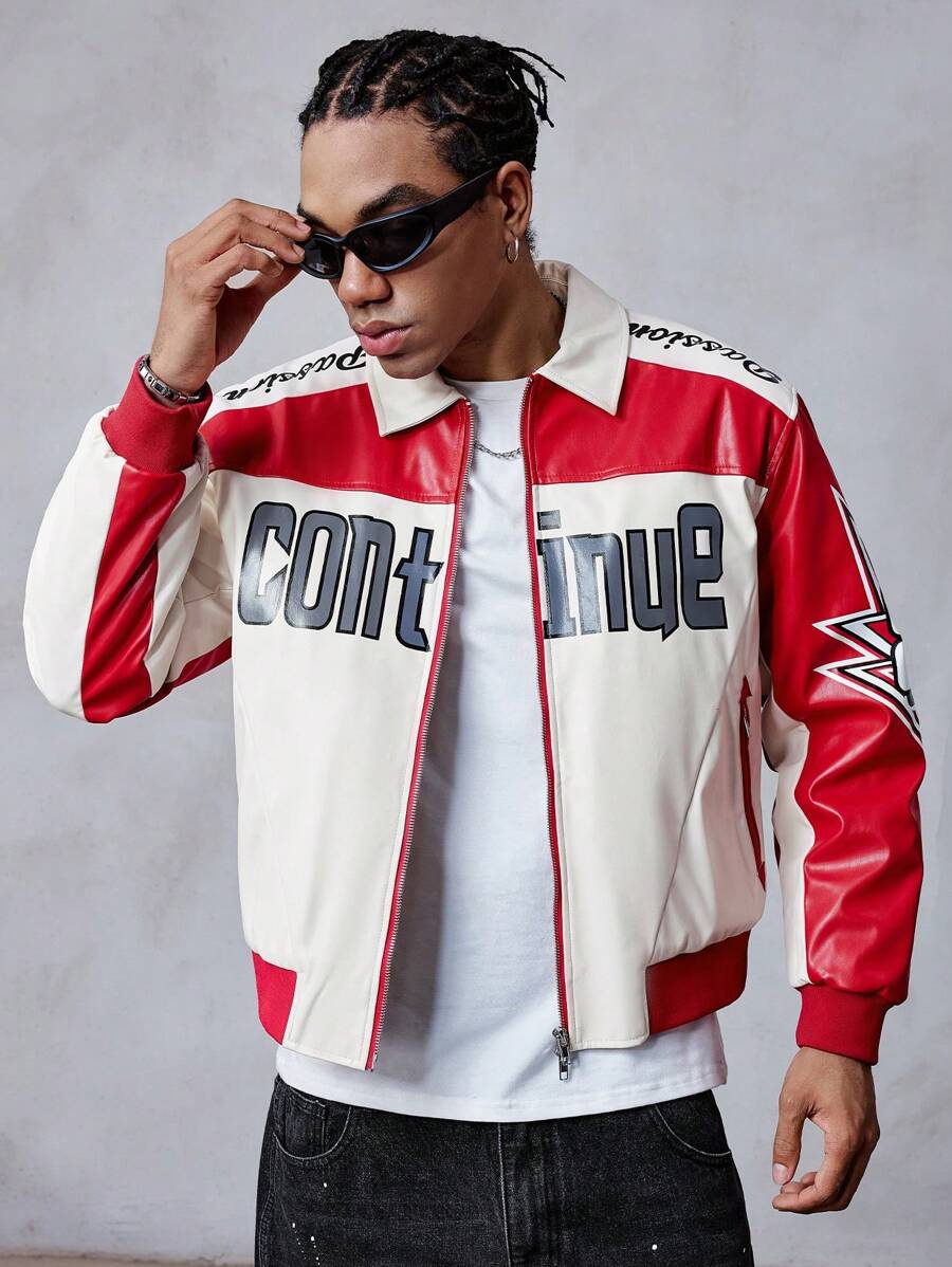 Street Life Men's Loose Pu Color Block Zip Up Sports Jacket