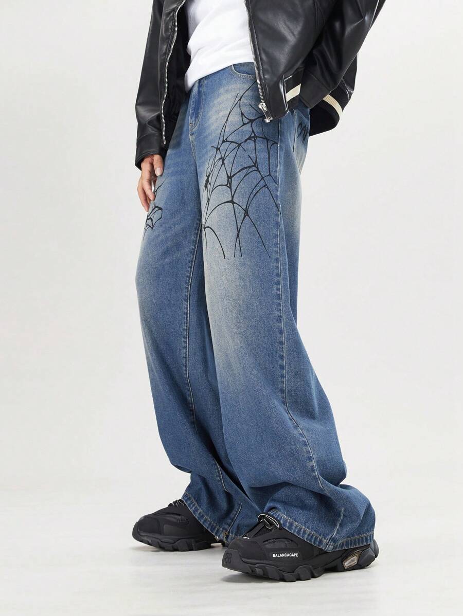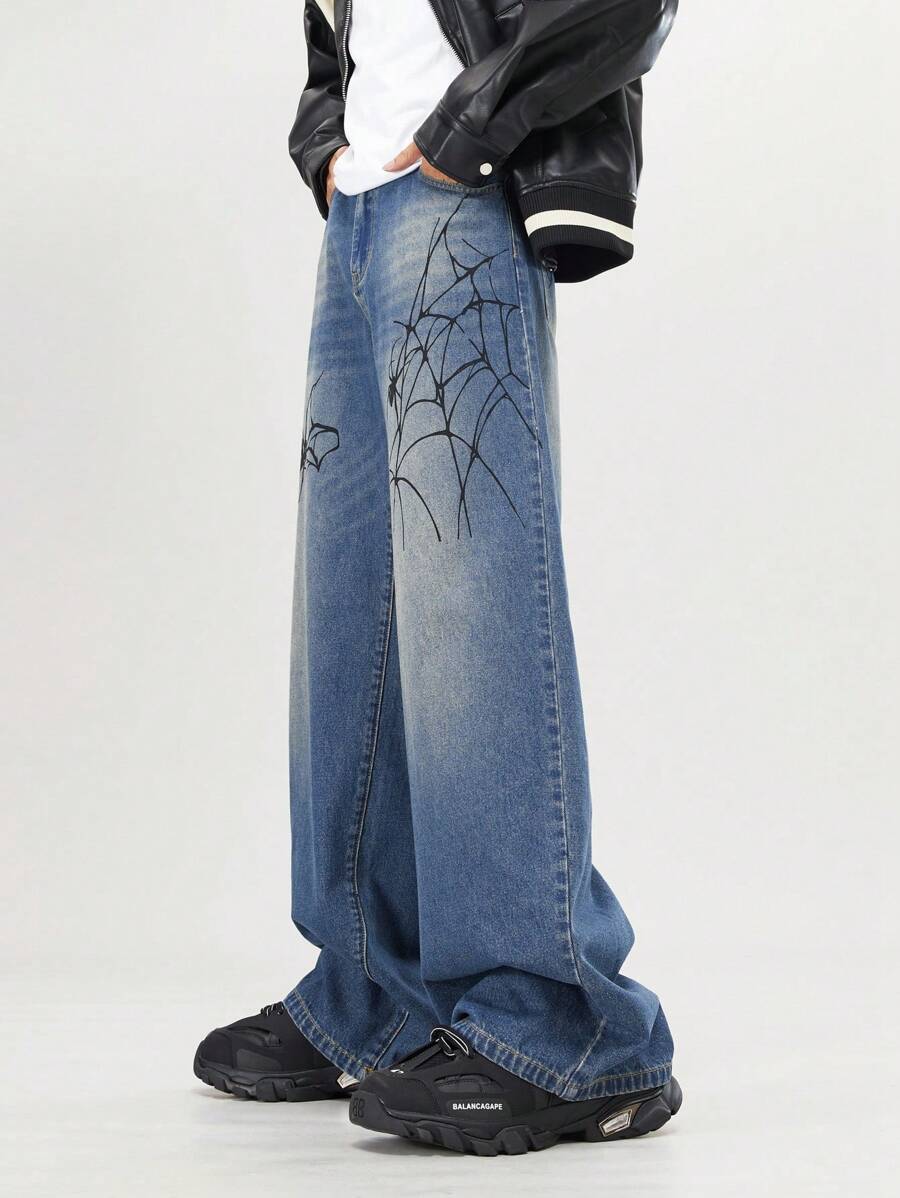Street Life Men's Loose Spider Print Pocketed Wide Leg Casual Jeans