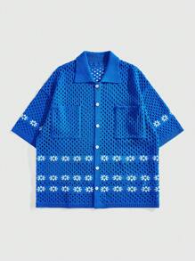 Street Life Men's Loose Vacation Dropped Shoulder Floral Hollow Out Single Breasted Pocket Knitted Casual Cardigan