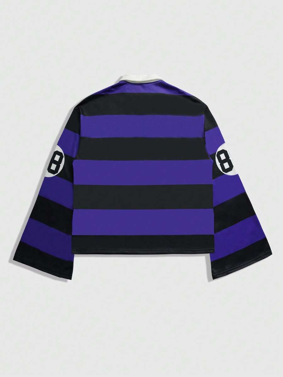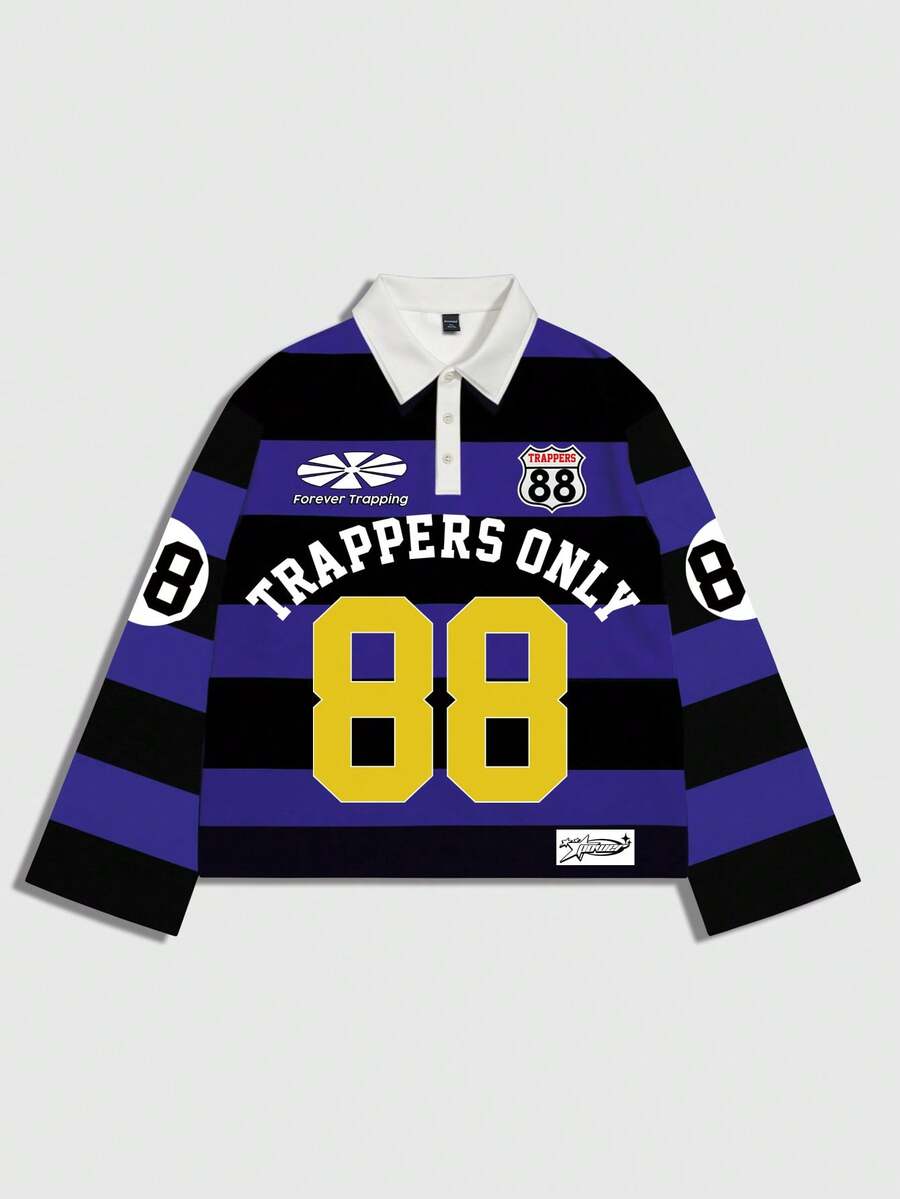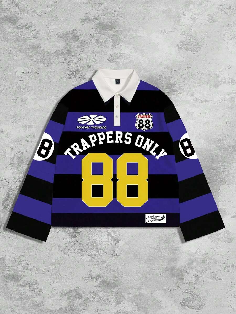 Street Life Men's Printed Preppy Long Sleeve Striped Polo Collar T-Shirt, Casual College Style Top