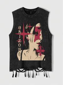 Street Life Men's Ripped Hem & Star Girl Print Anime Distressed Short Sleeve T-Shirt