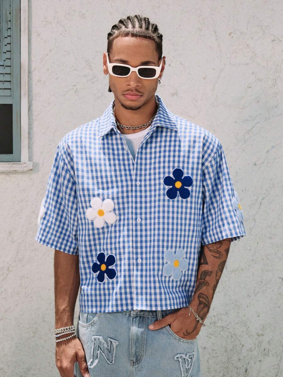 Casual Men's Simple Floral Plaid Fashion Shirt, Suitable For Summer Vacation