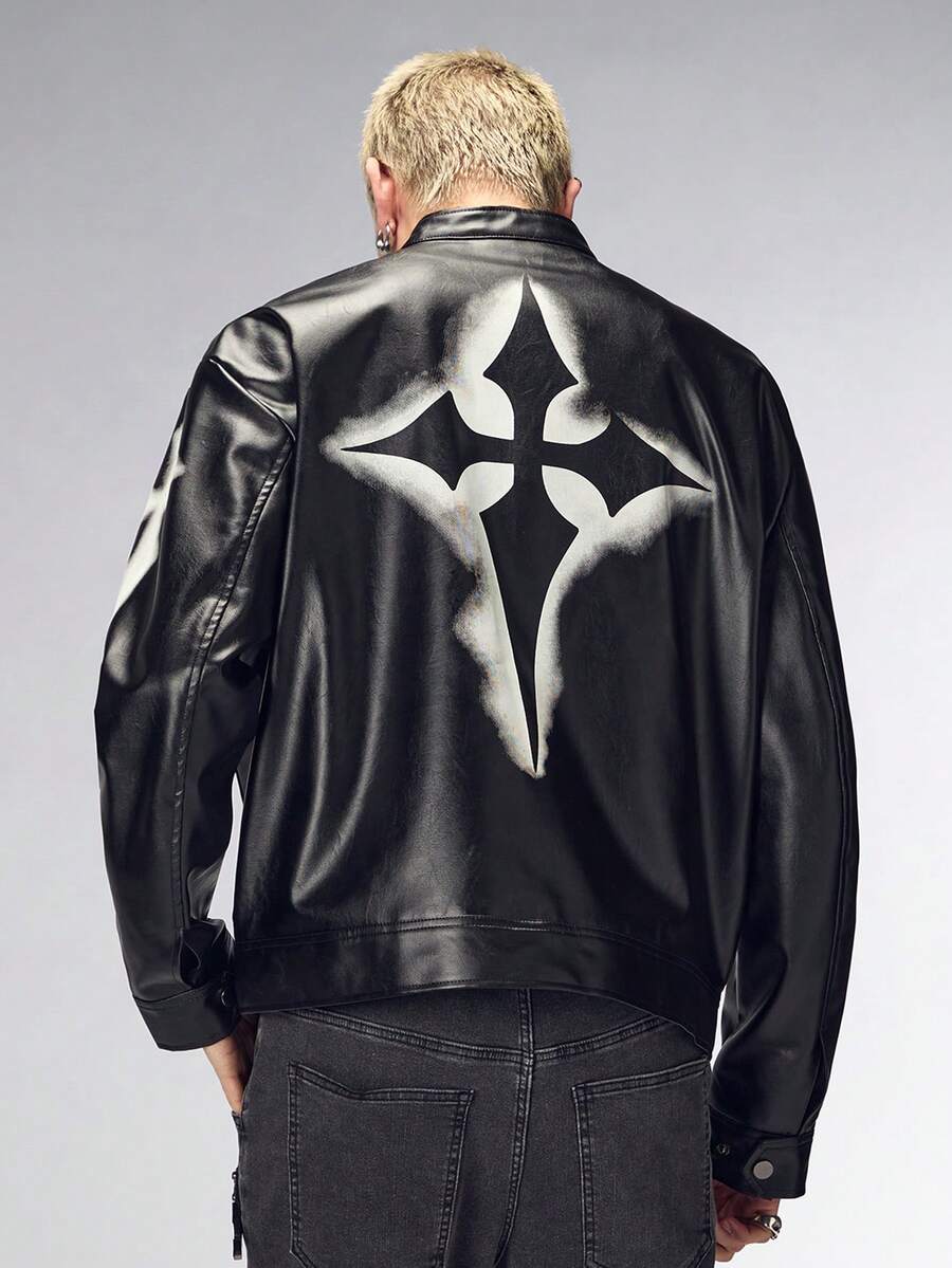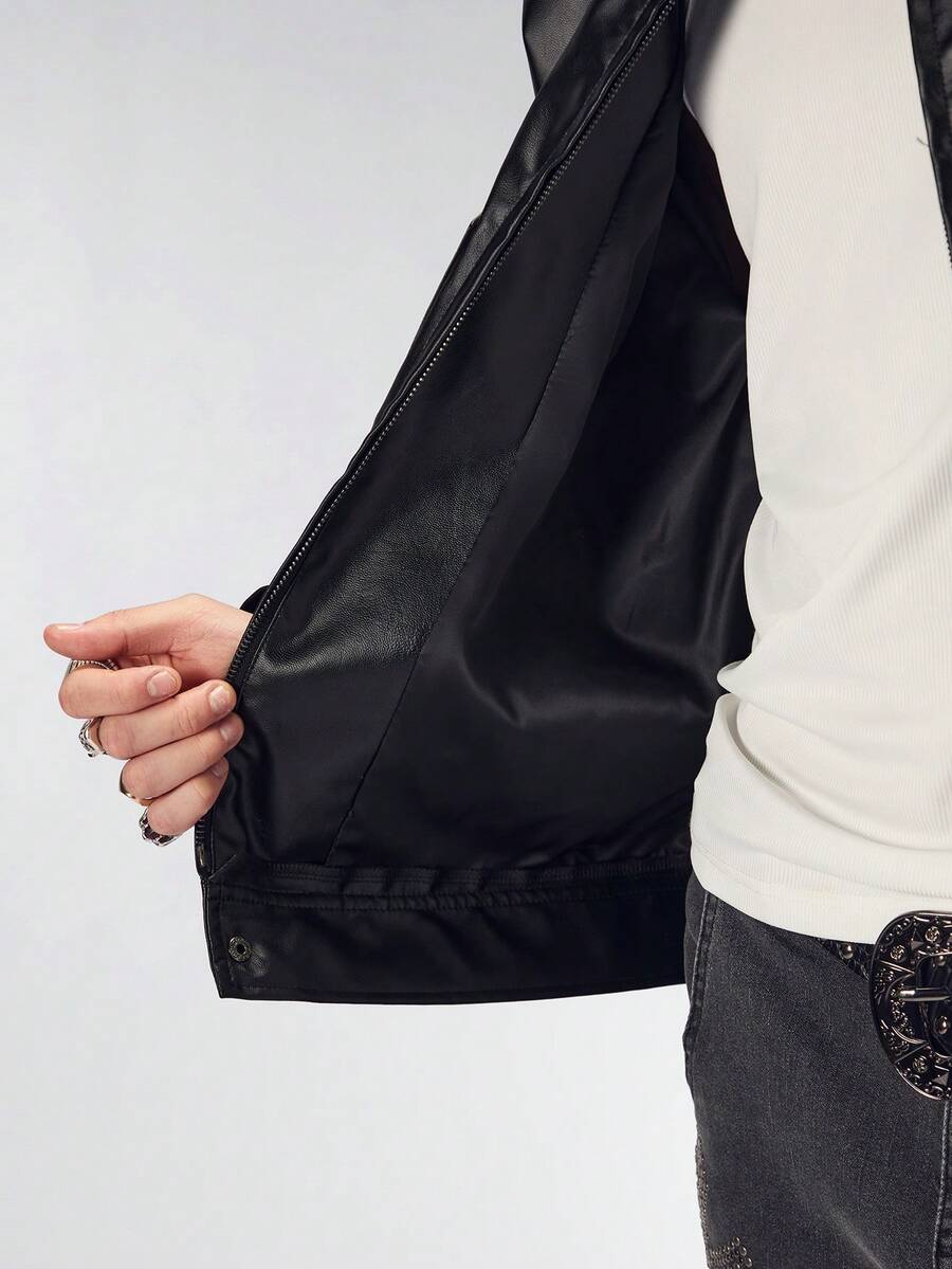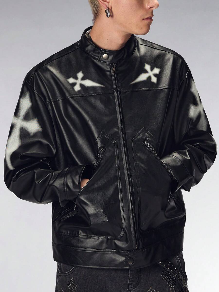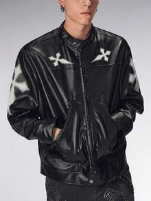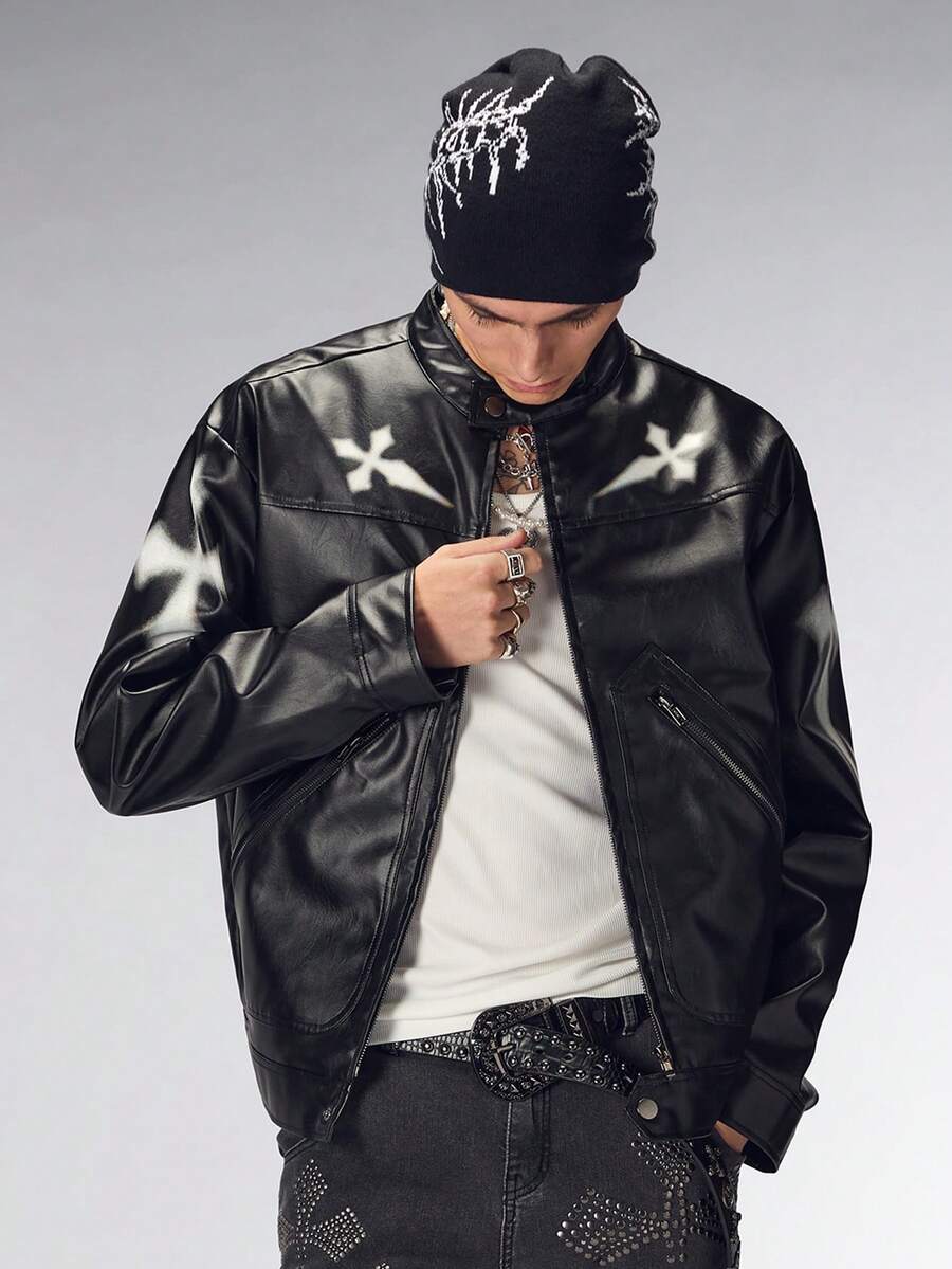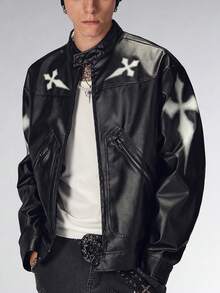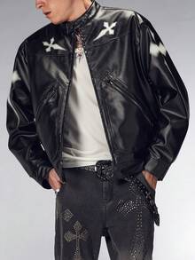 Street Life Men's Stand Collar Cross Pattern Pocket Zipper Front Fashionable Motorcycle Jacket, Long Sleeve