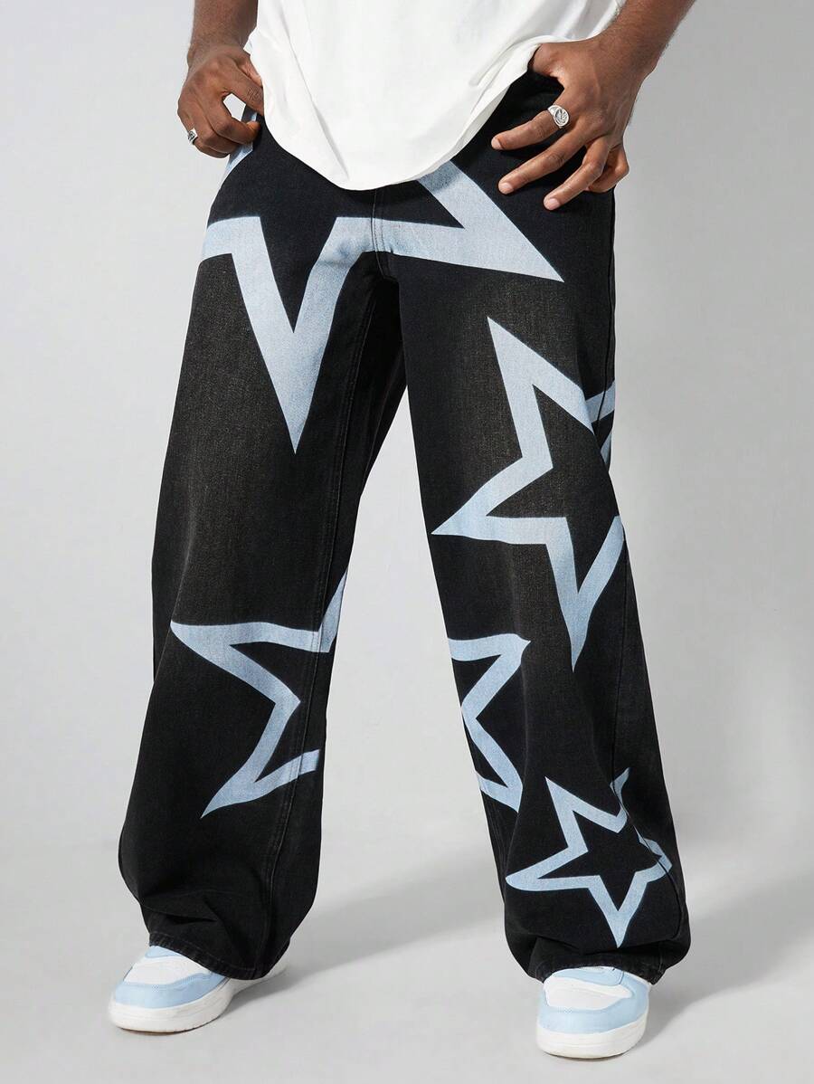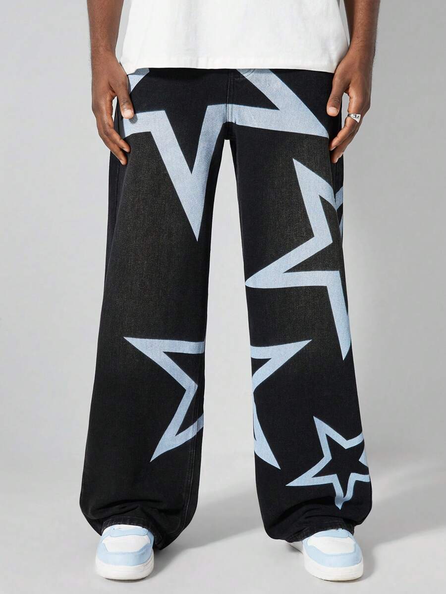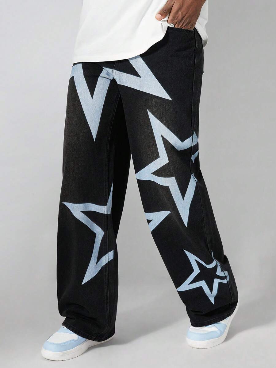 Street Life Men's Star Printed Loose Fit Straight Leg Jeans, Street Style