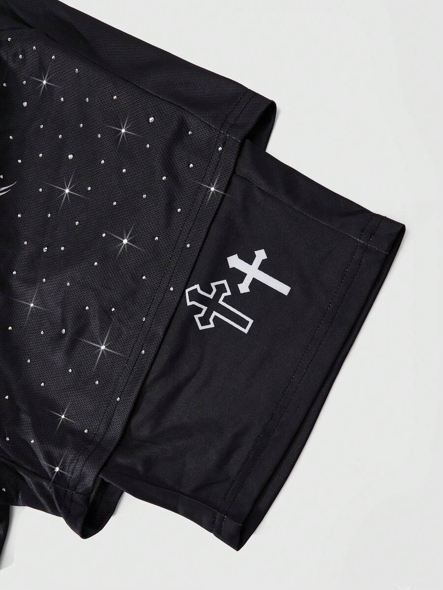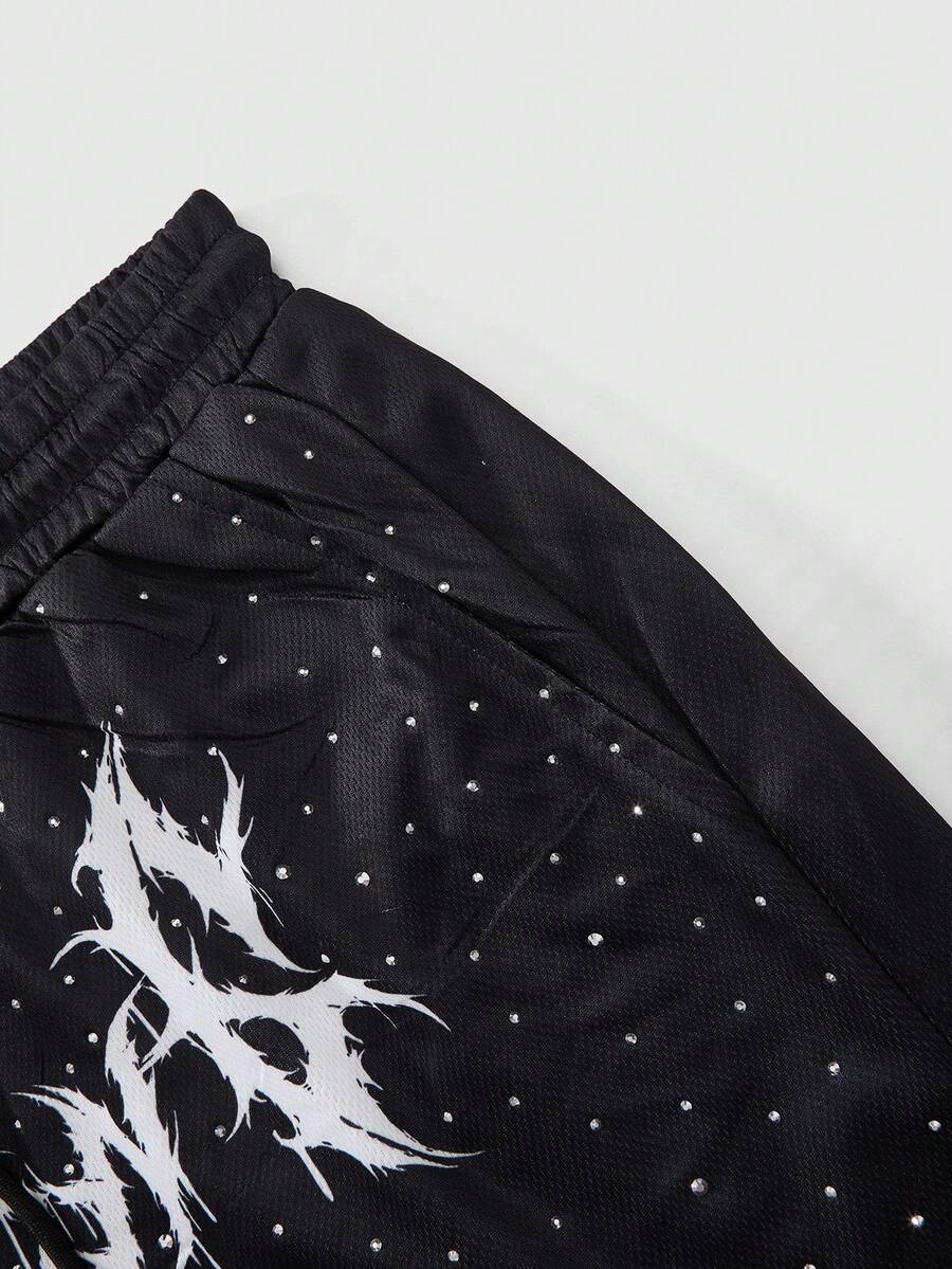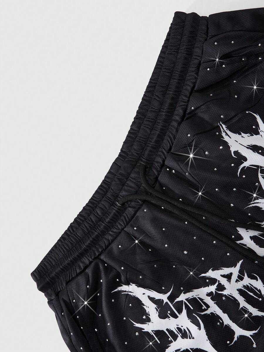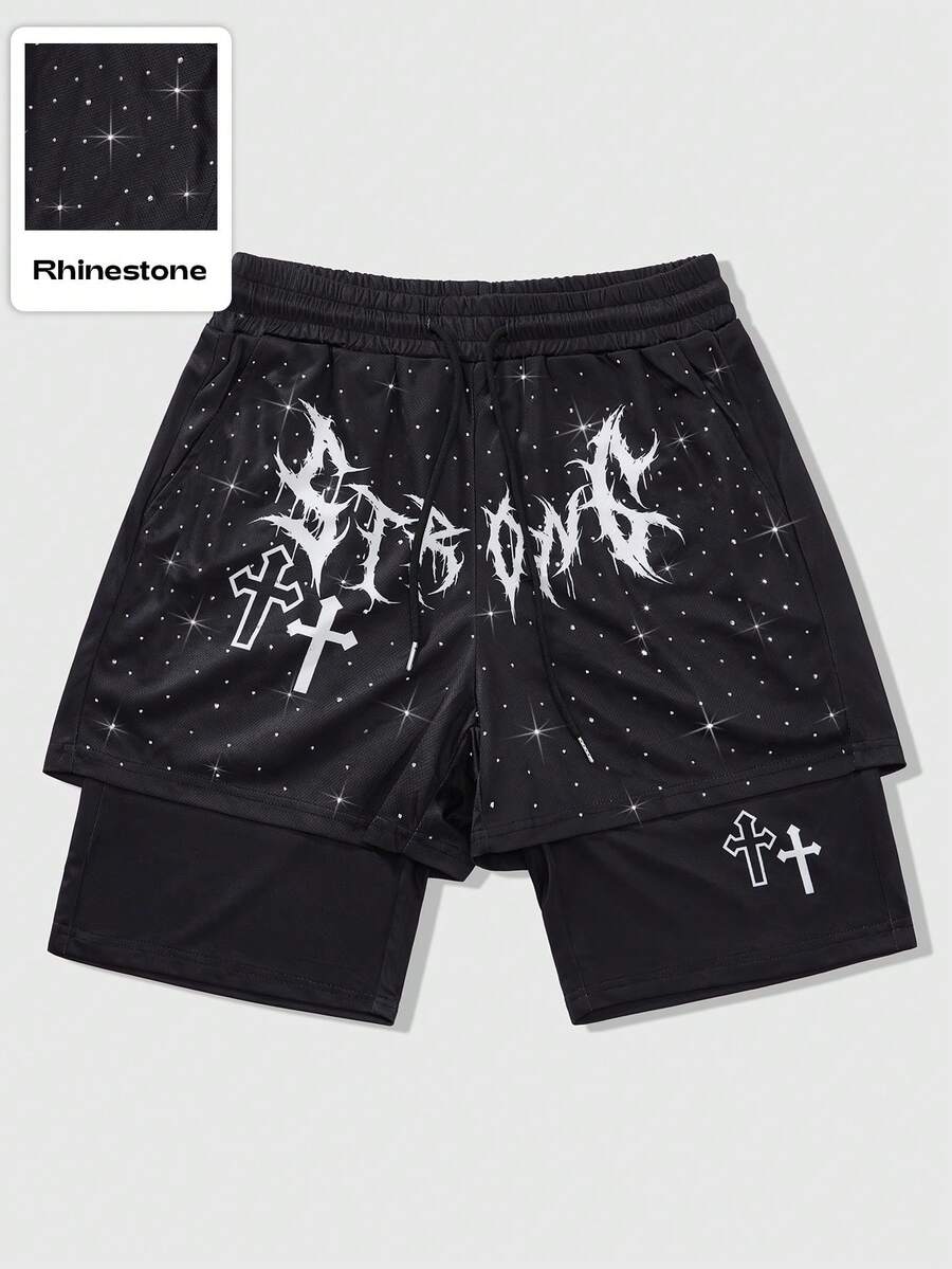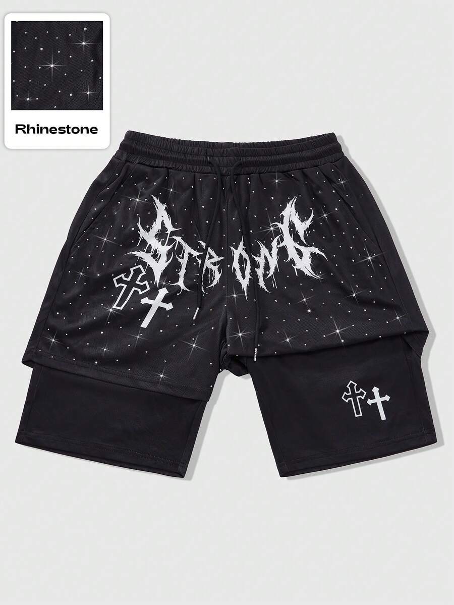 Street Life Men's Street Fashion 2 In 1 Shorts, Rhinestone English Letter Graphic Print Design With Gothic Elements, Halloween