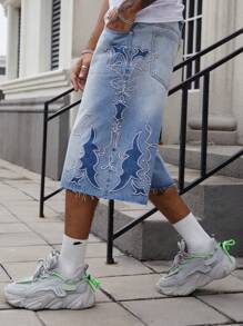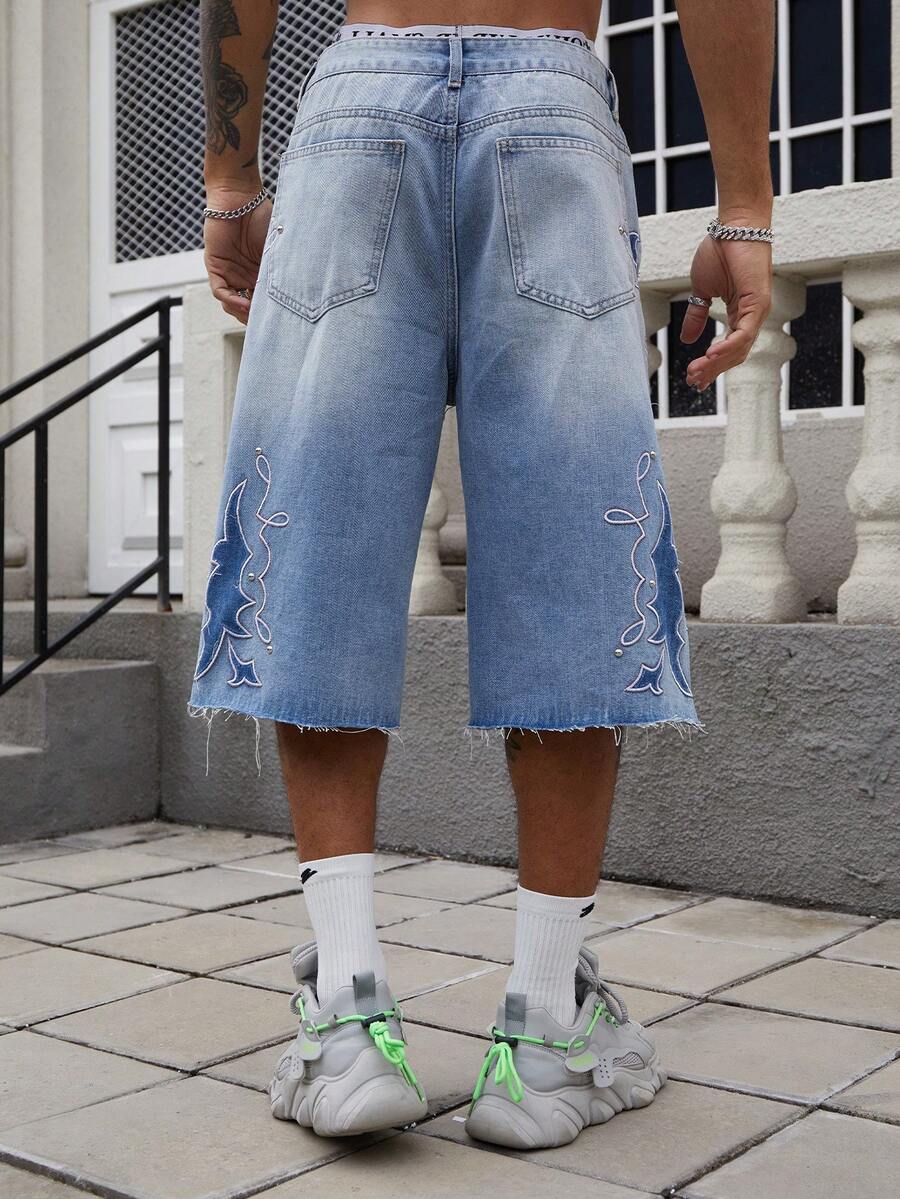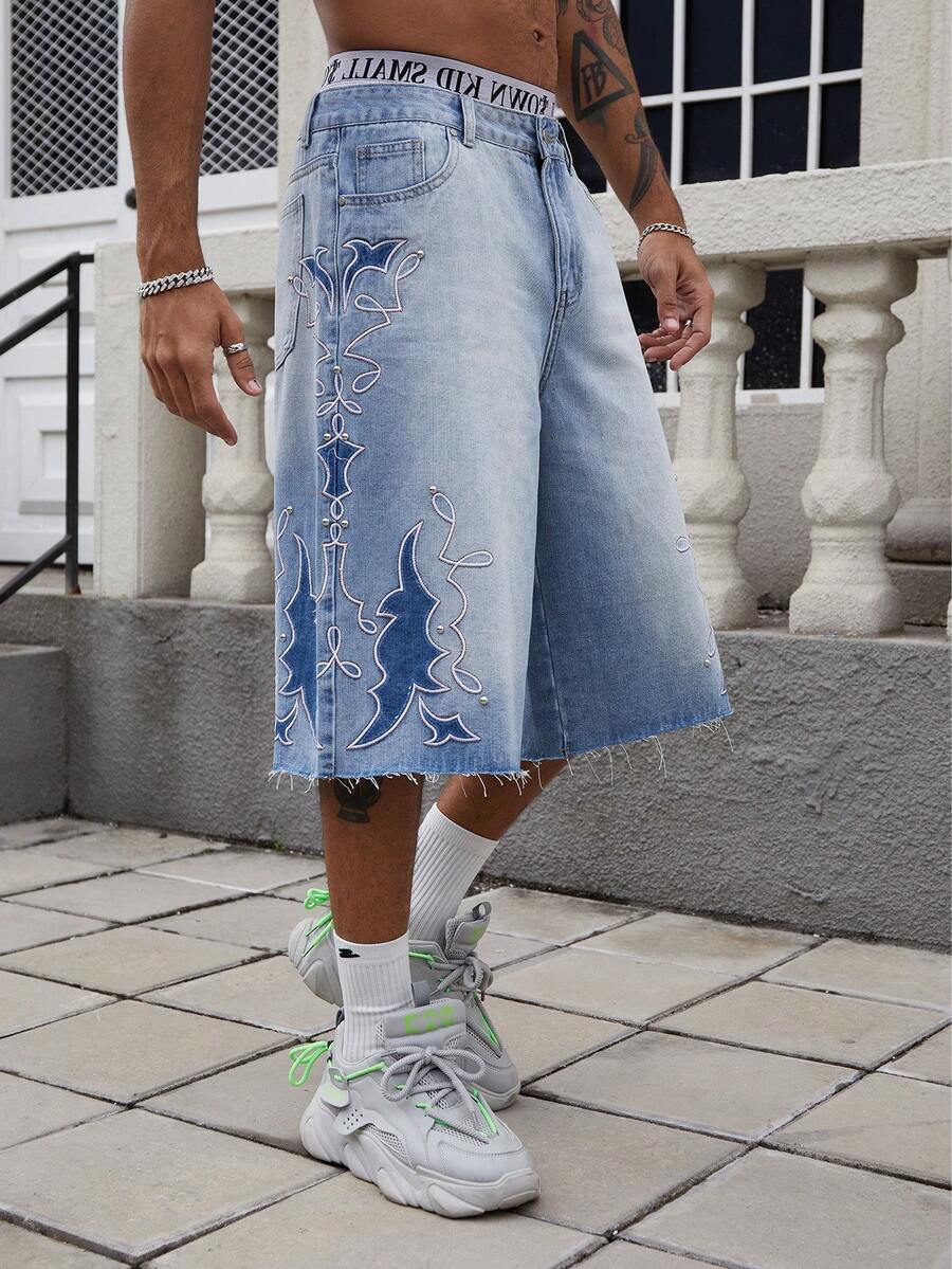 Street Life Men's Summer Casual Vintage Fringed Embroidery Pattern Denim Shorts