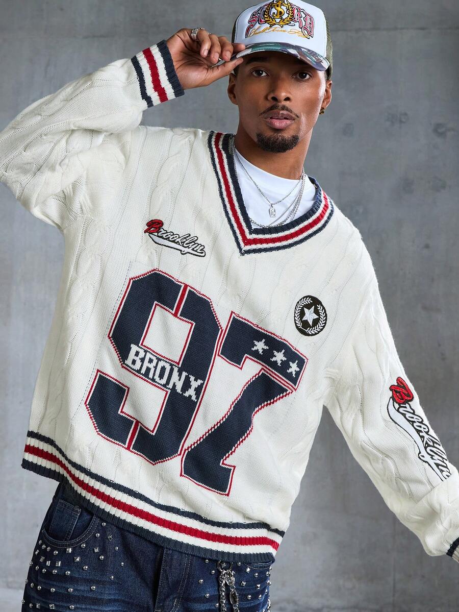 Street Life Men's V-Neck Numeric Embroidery Long Sleeve Casual Loose Knit Sweater