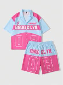 Preppy Men's Color Blocking Letter Number Print Shirt And Shorts Set