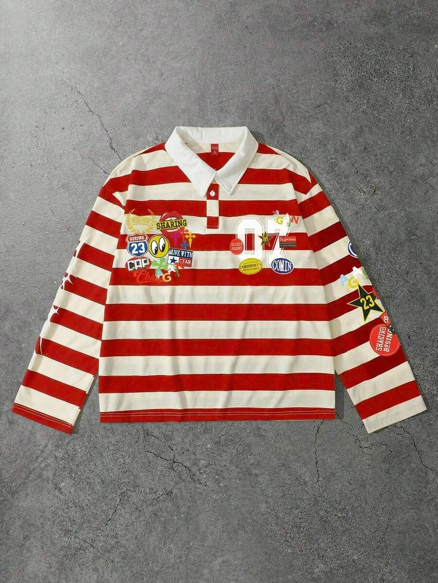 Street Life Spring Casual Graphic Red Men'S Casual Striped Loose Fit Cartoon Print Long Sleeve Polo Shirt