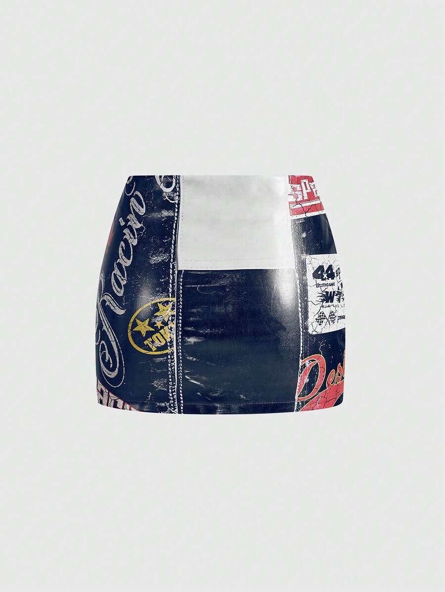 Street Life SummergraphicWomen's PU Patchwork Distressed Print Motorcycle Super Low Waist Sexy Bodycon Mini Skirt
