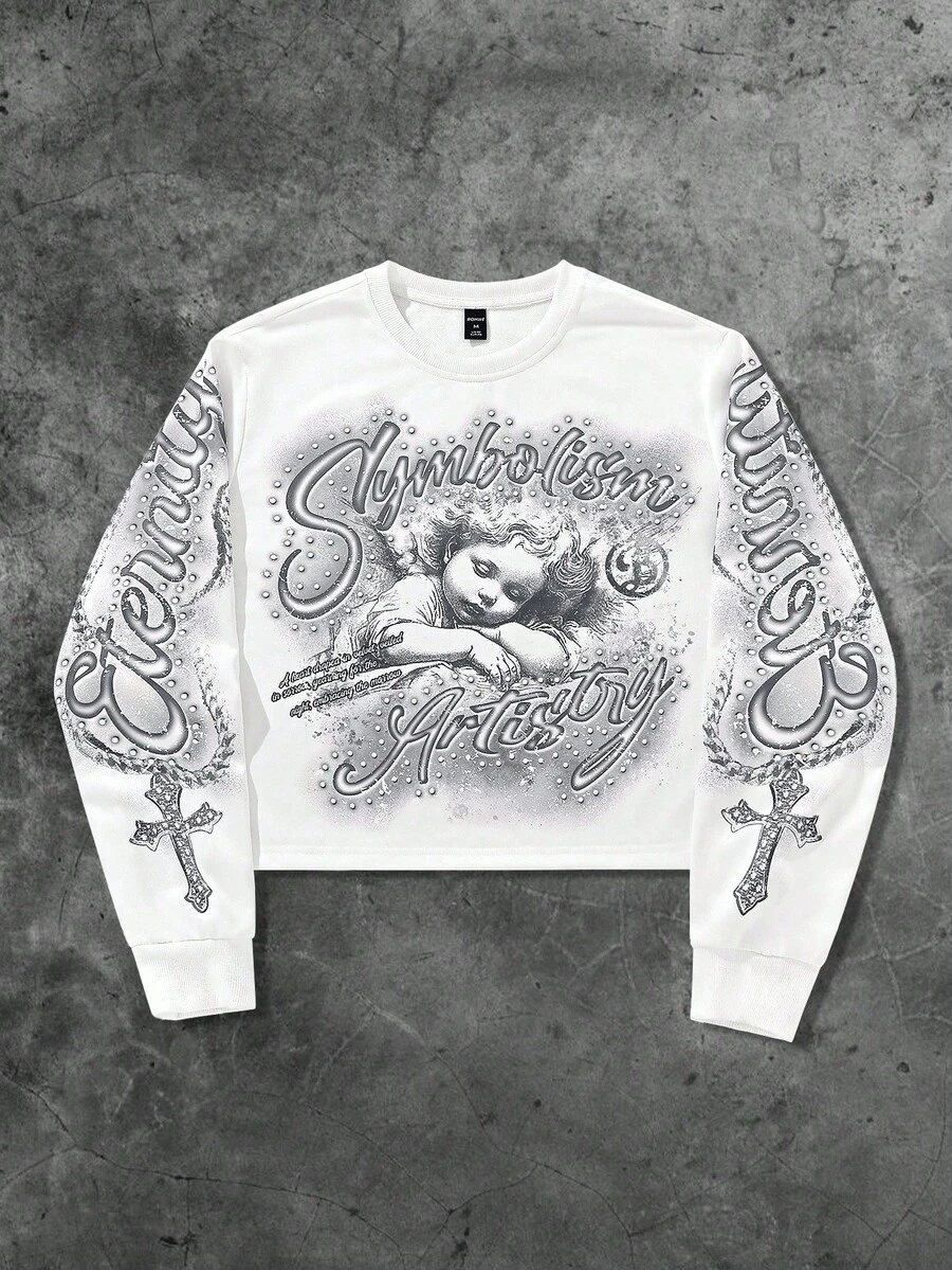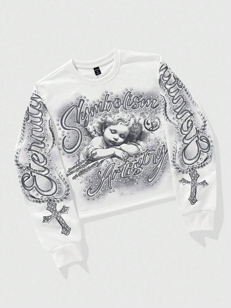 Street Life Teen Boy Letter & Cross Print Crew Neck Long Sleeve Pullover Sweatshirt