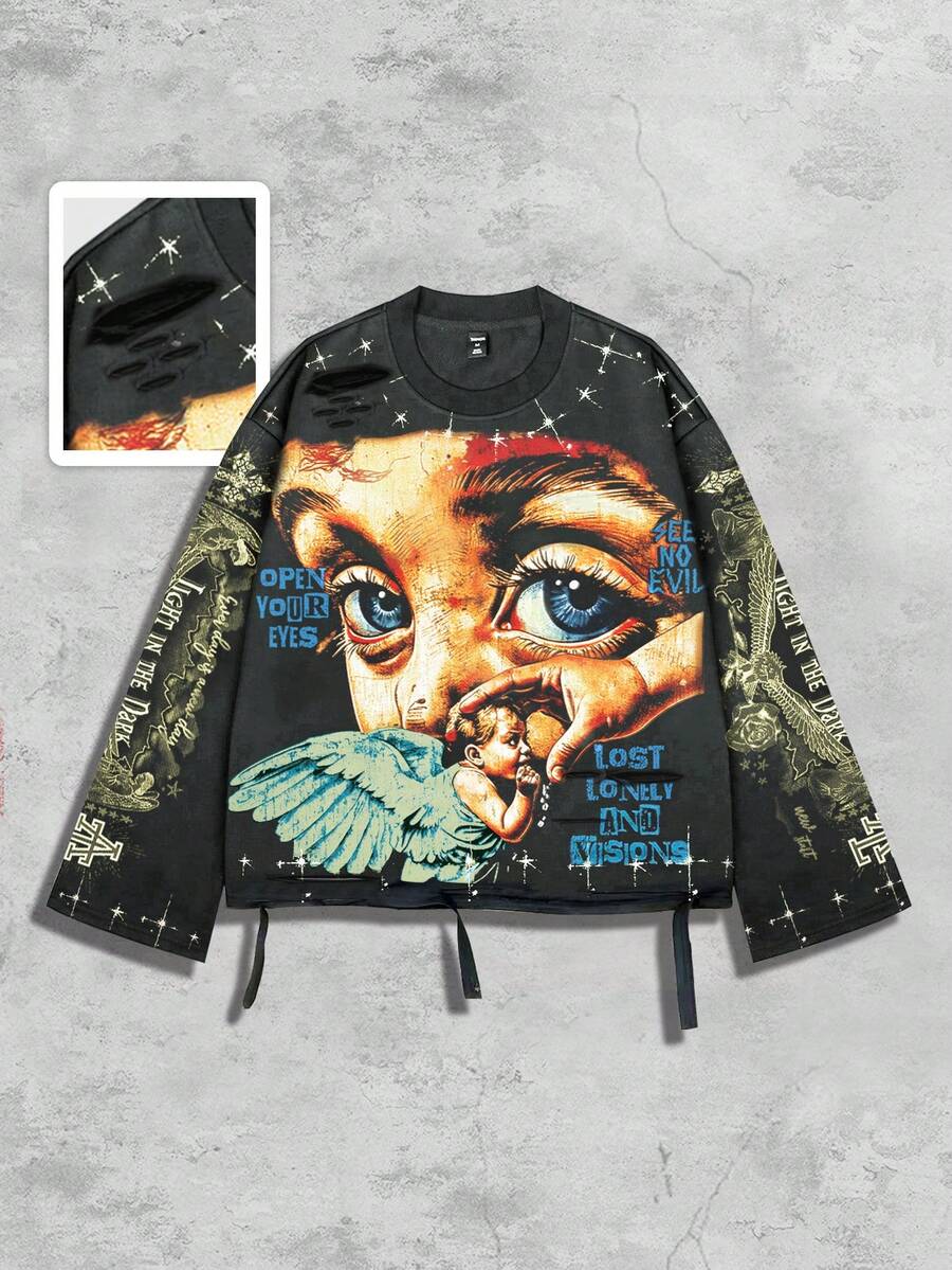Street Life Vintage Street Style Distressed Saint Graphic Long Sleeve Crew Neck Men's T-Shirt