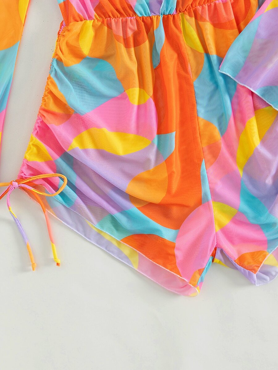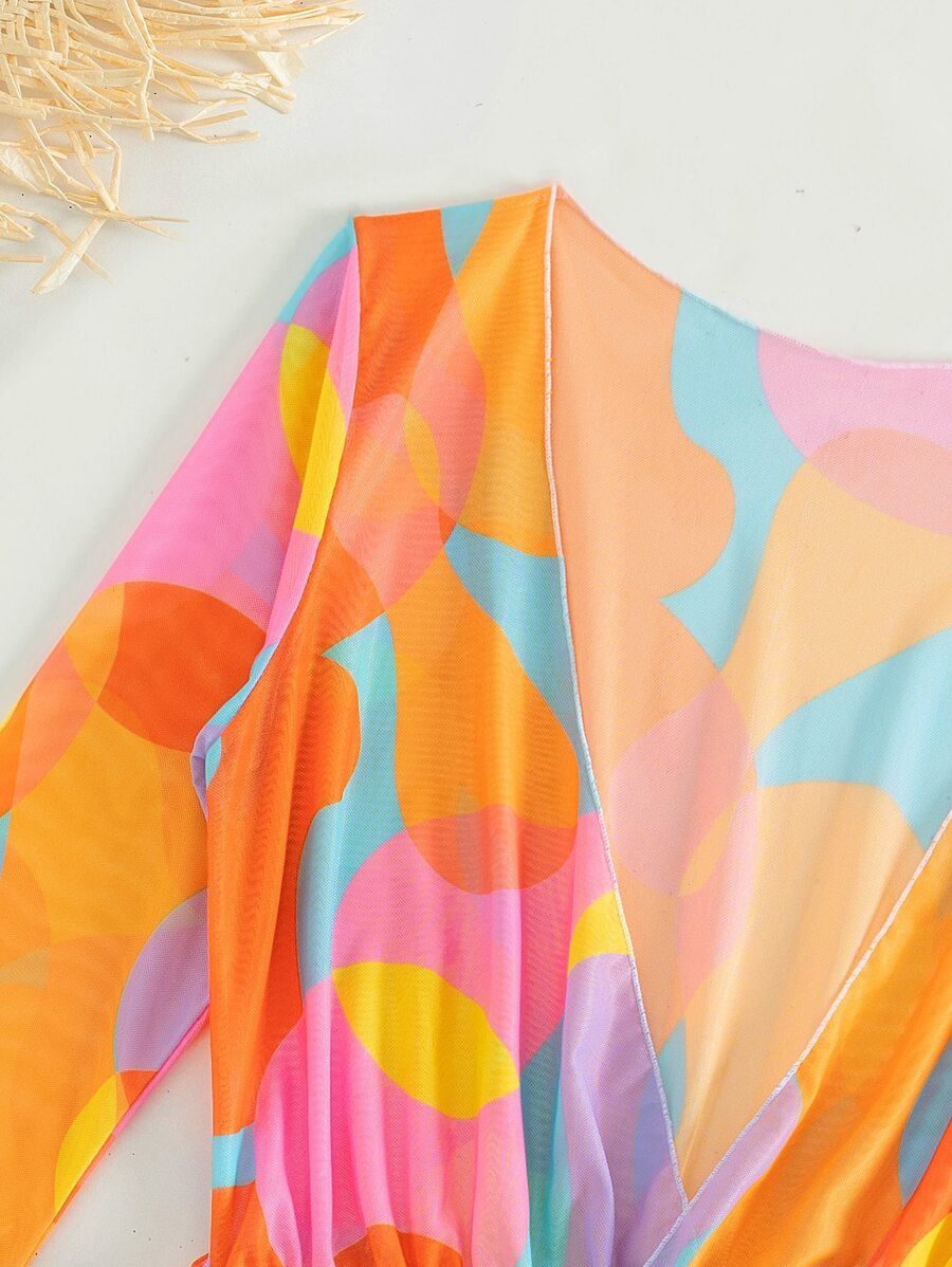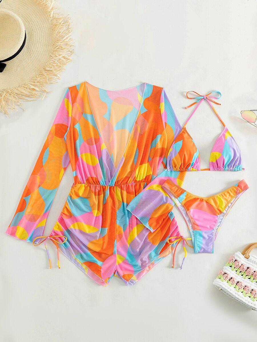 Summer Beach Allover Print Bikini Set Halter Triangle Bra & Bikini & Long Sleeve Cover Up Romper 3 Pieces Bikini