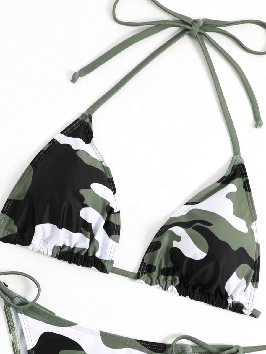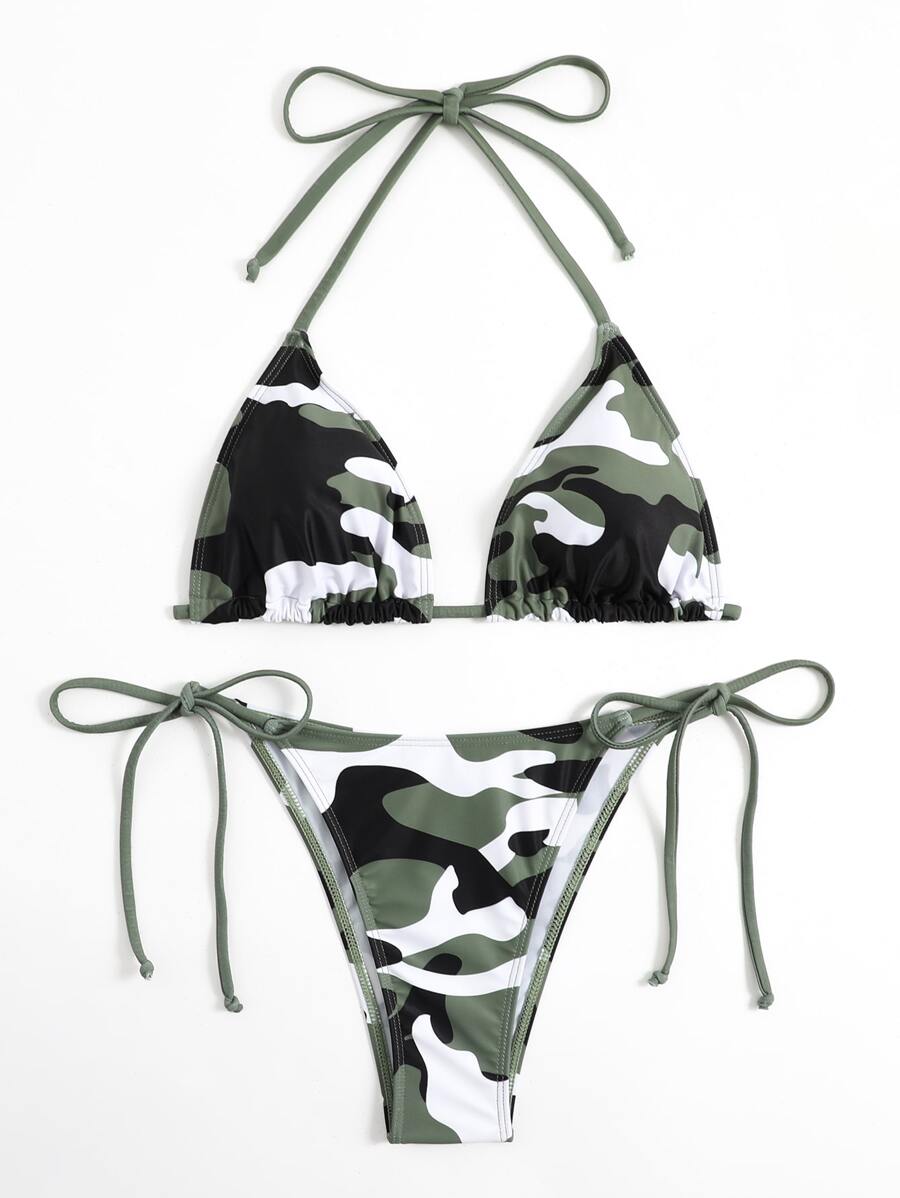Summer Beach Camo Print Bikini Set Halter Triangle Bra & Tie Side Bottom 2 Pieces Bikini