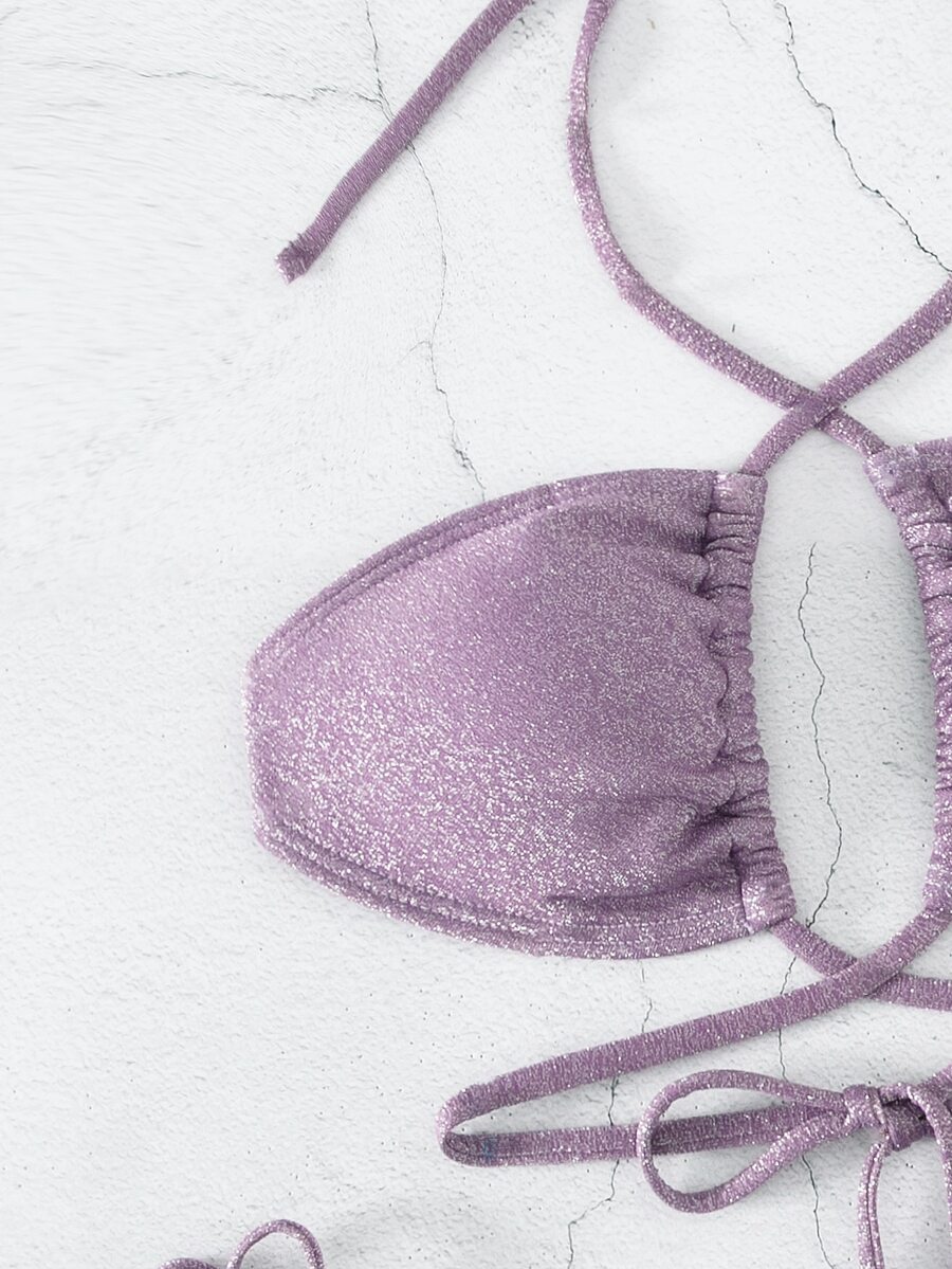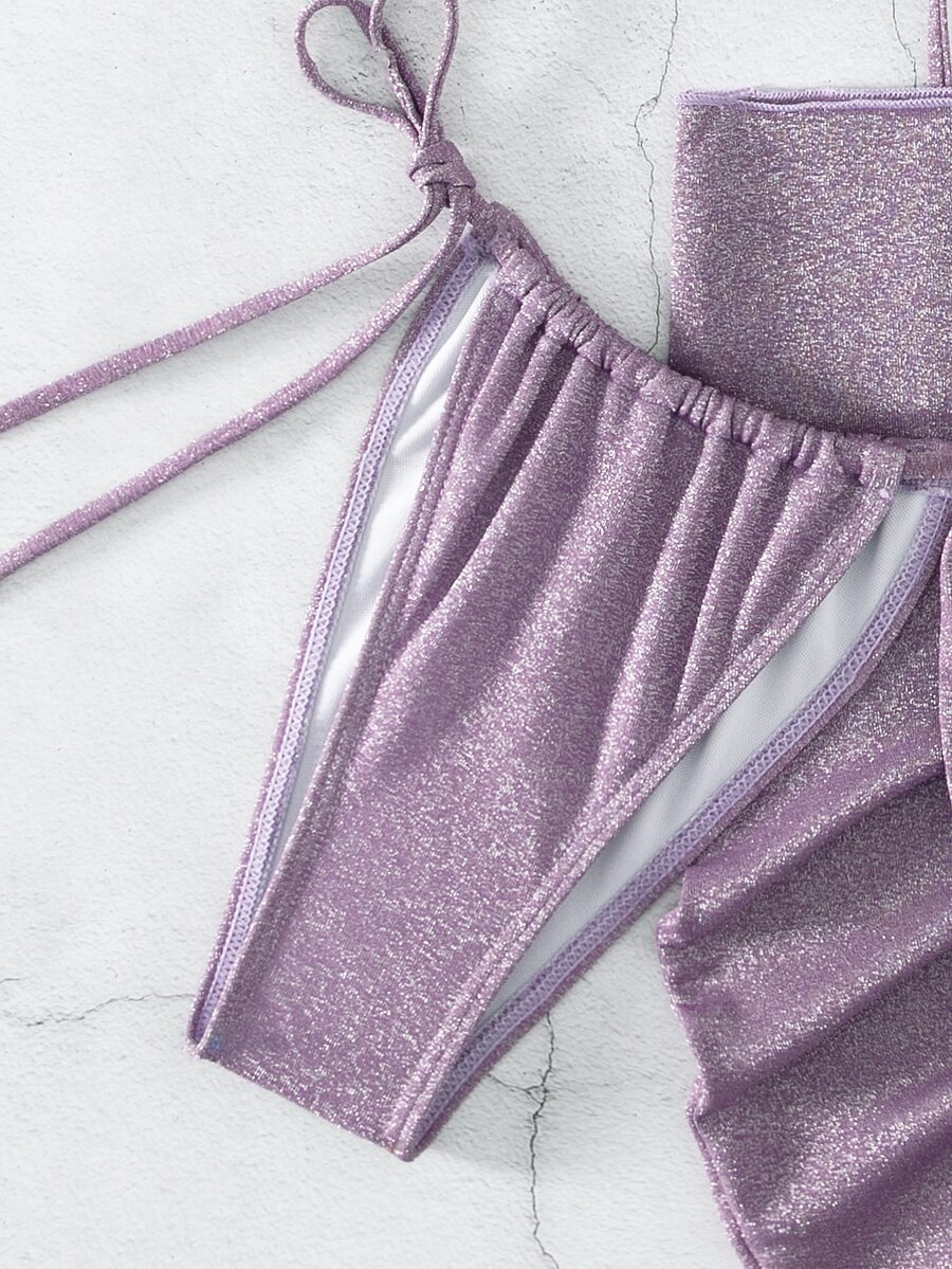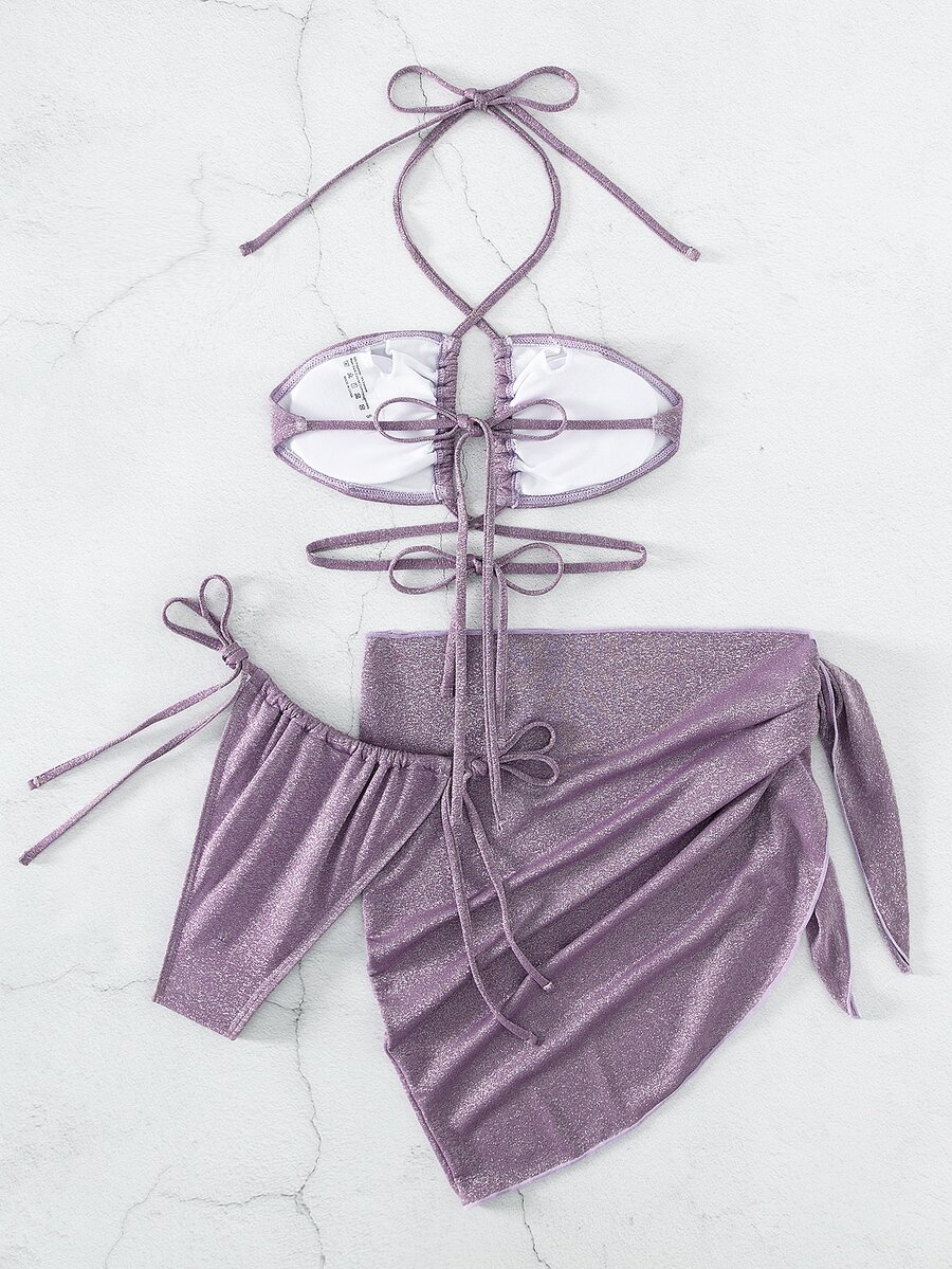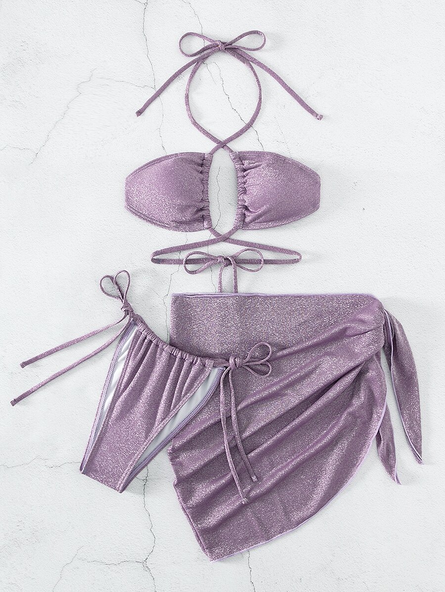 Summer Beach Glitter Bikini Set Halter Bra & Tie Side Bottom & Beach Skirt 3 Piece Bathing Suit