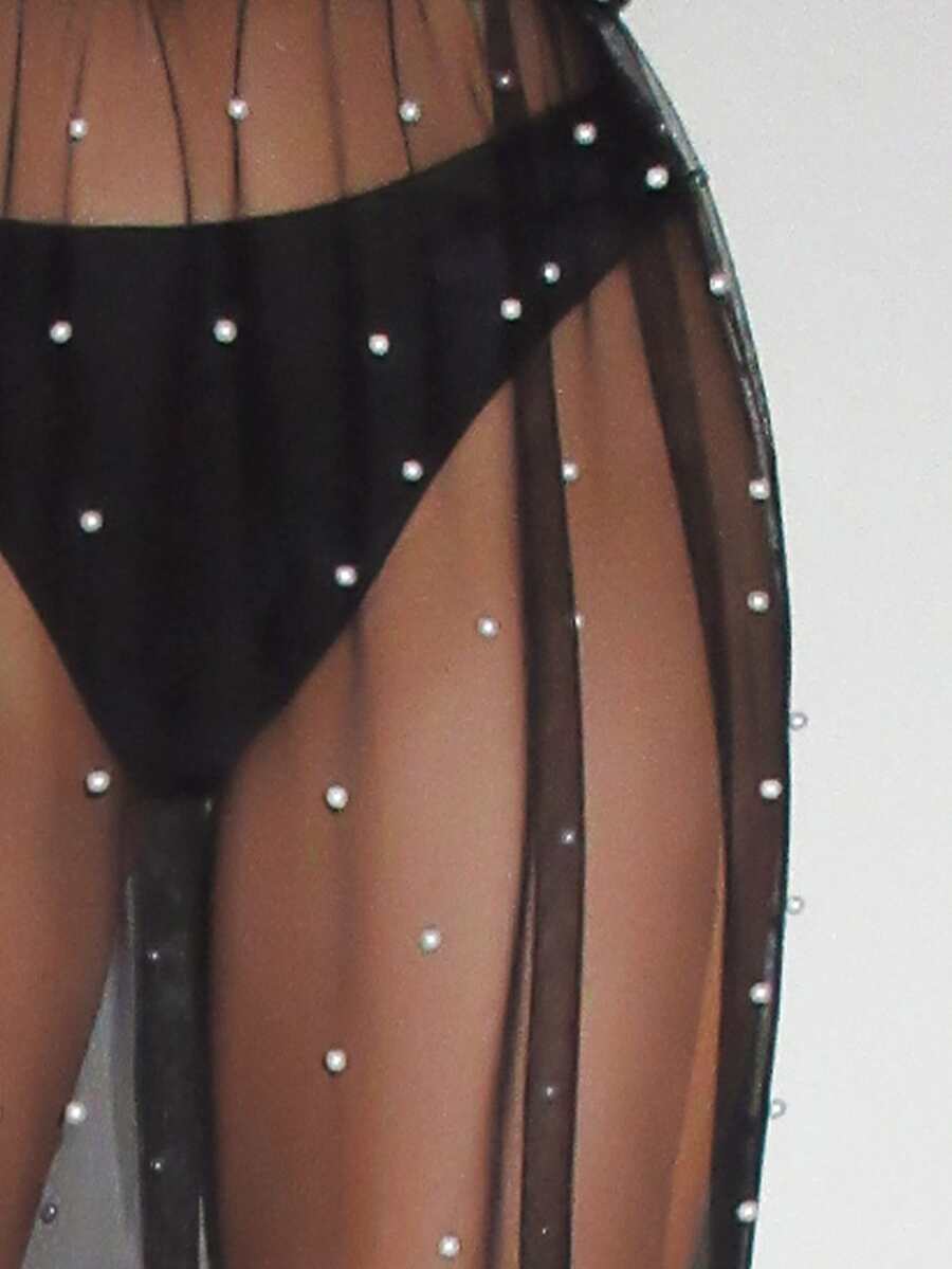 Summer Beach Pearls Beaded Sheer Split Thigh Mesh Overlay Skirt Without Panty, Halloween