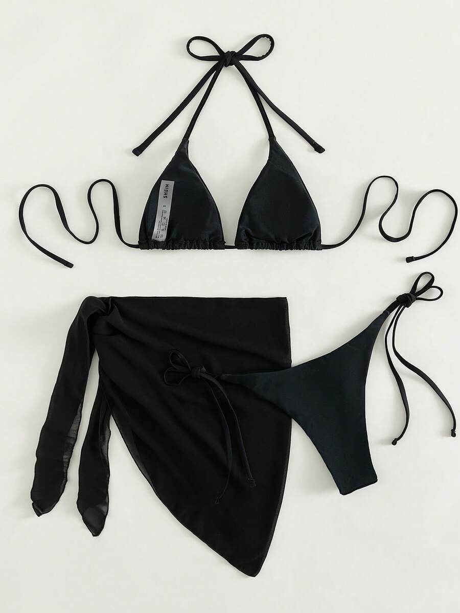Summer Beach Solid Bikini Set Triangle Bra & Thong Bottom & Beach Skirt 3 Piece Bathing Suit Beach Outfits