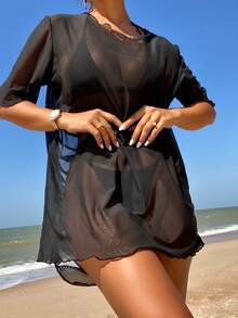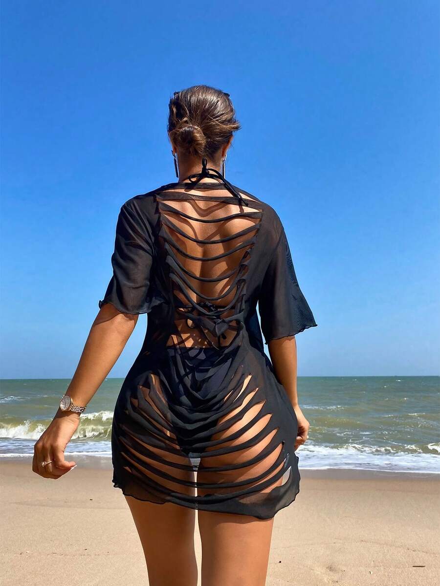 Women's Solid Color Backless Ripped Short Sleeve Mesh Cover Up Dress, Vacation