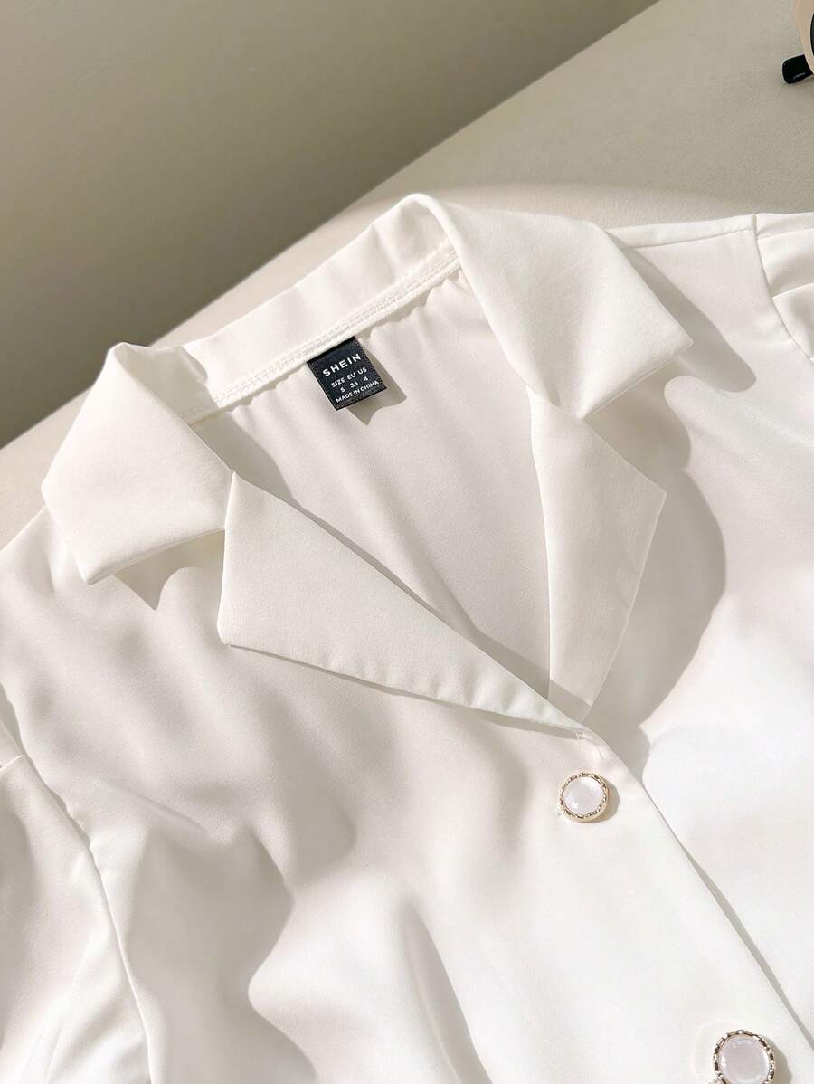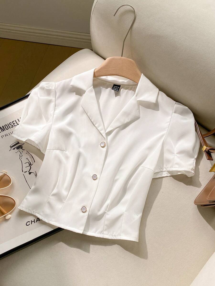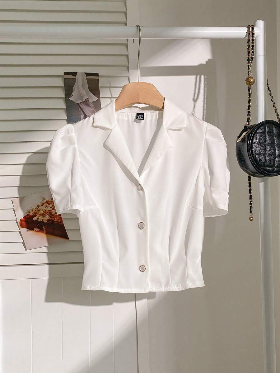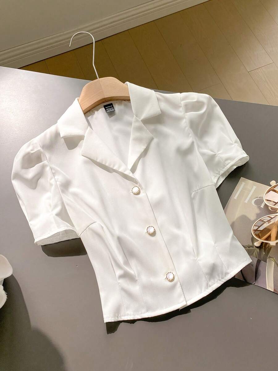 Summer White Lapel Collar Puff Sleeve Button Up Blouse