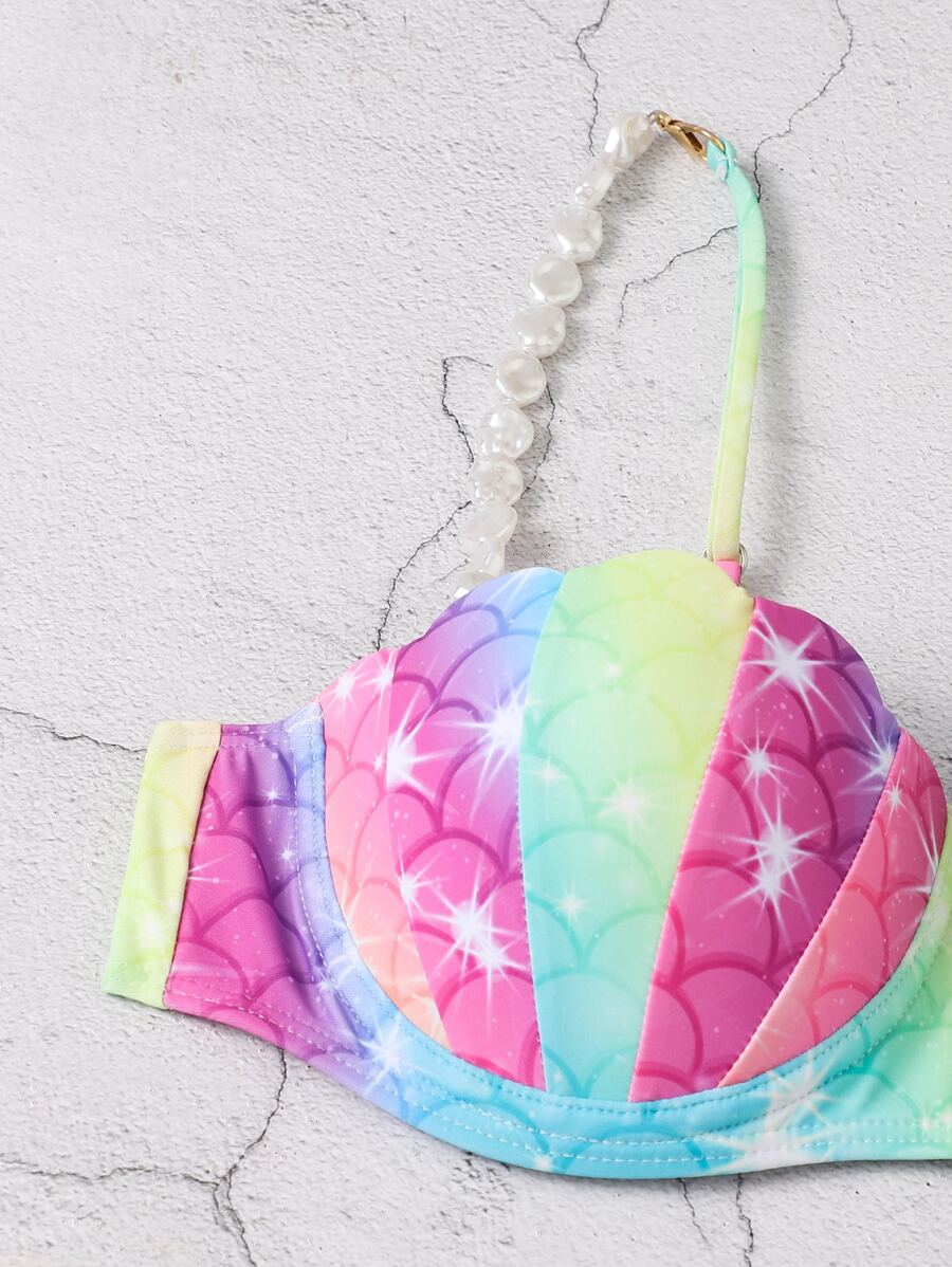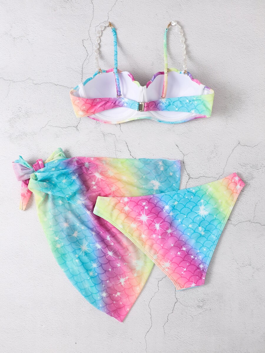 Swim Suits For Women Summer Beach Ombre Fish Scales Print Bikini Set Scallop Trim Push Up Top & Bikini & Beach Skirt 3 Pieces Bikini
