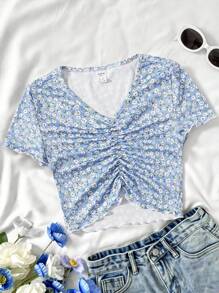 Teen Girls Ditsy Floral Lettuce Trim Ruched Tee