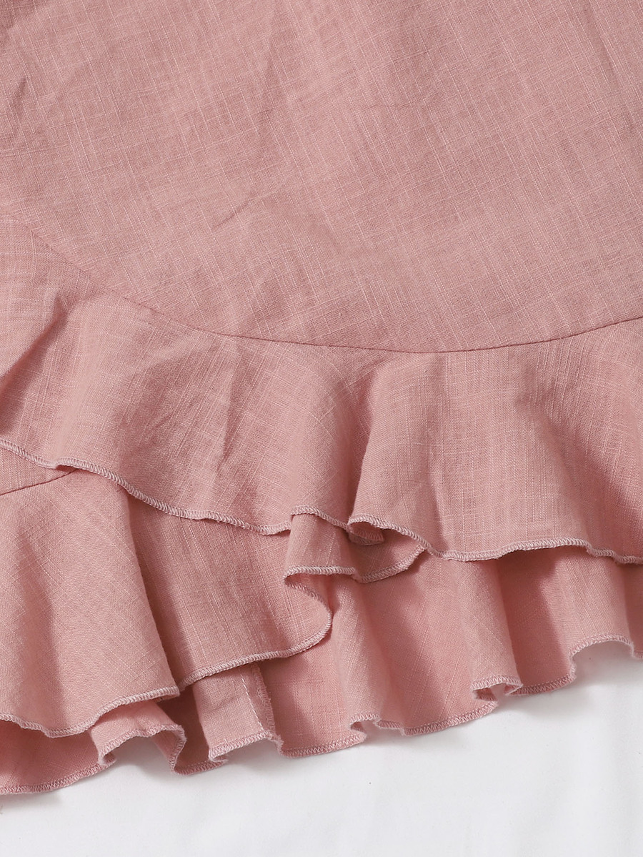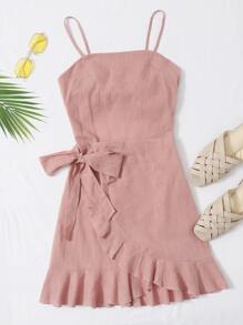 Tied Open Back Ruffle Trim Wrap Front Cami Dress