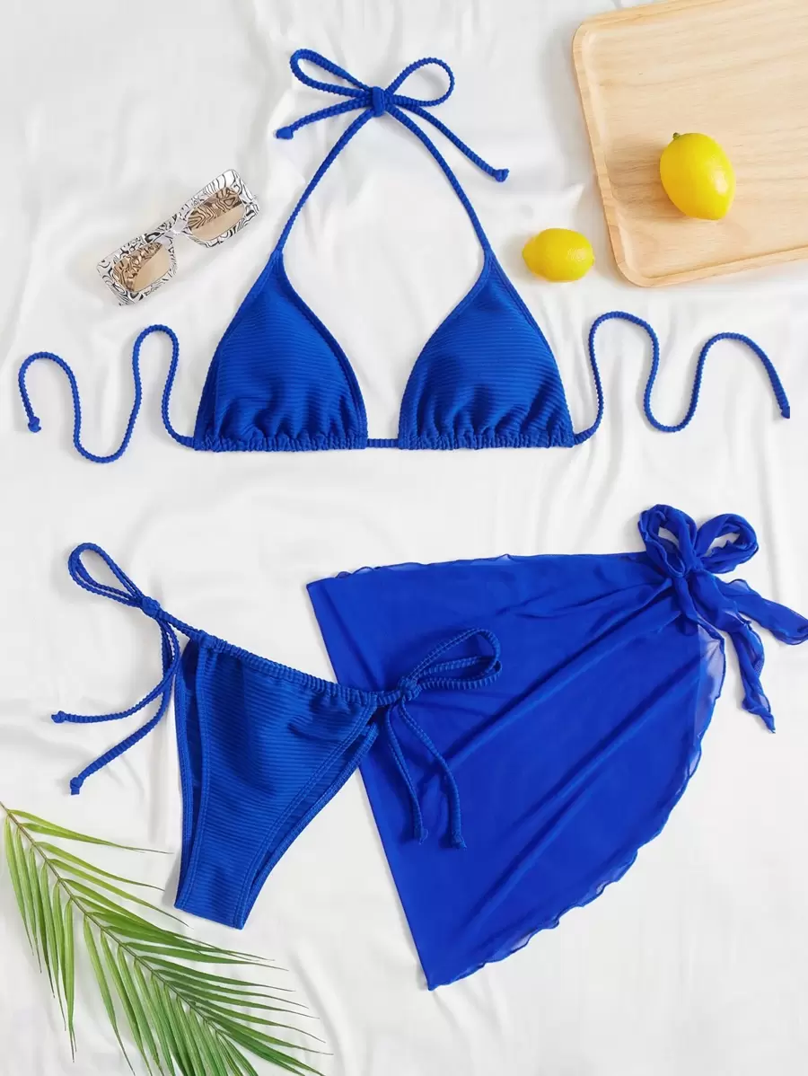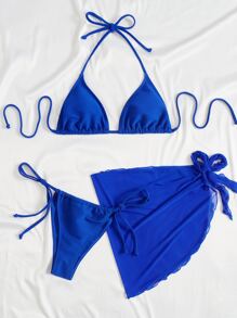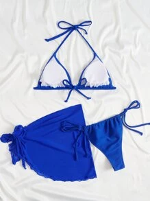 Triangle Tie Side Summer Beach Bikini Set With Lettuce Trim Mesh Beach Skirt