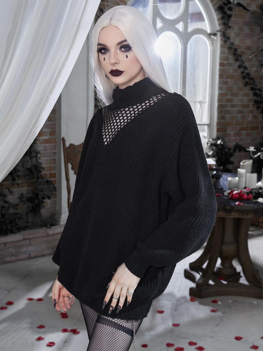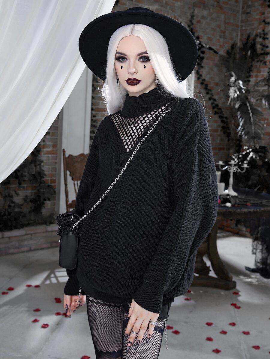 Turtleneck Open Knit Drop Shoulder Sweater