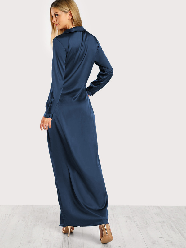 Twist Front Wrap Split Satin Maxi Shirt Dress