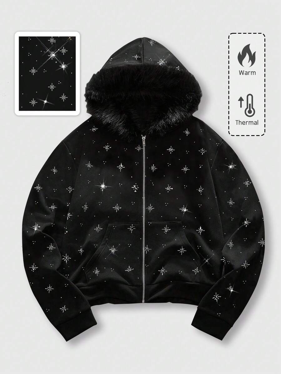 Unisex Couple Rhinestone Embellished Zip-Up Hoodie Sweatshirt