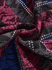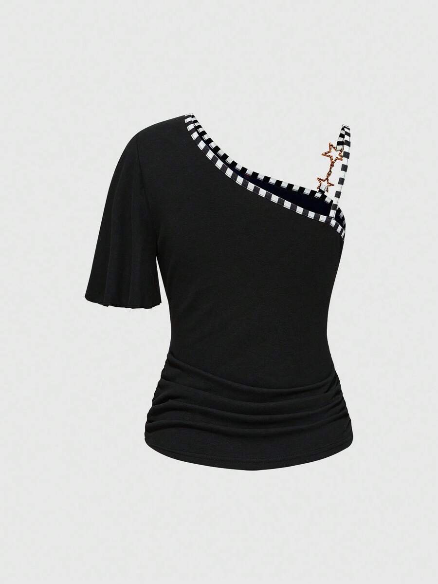 J-Fashion Vintage Cross Rhinestone & Foil Print Ruched Waist Retro Colorblock Black White Striped Trim Gold Star Shoulder Strap Asymmetric T-Shirt